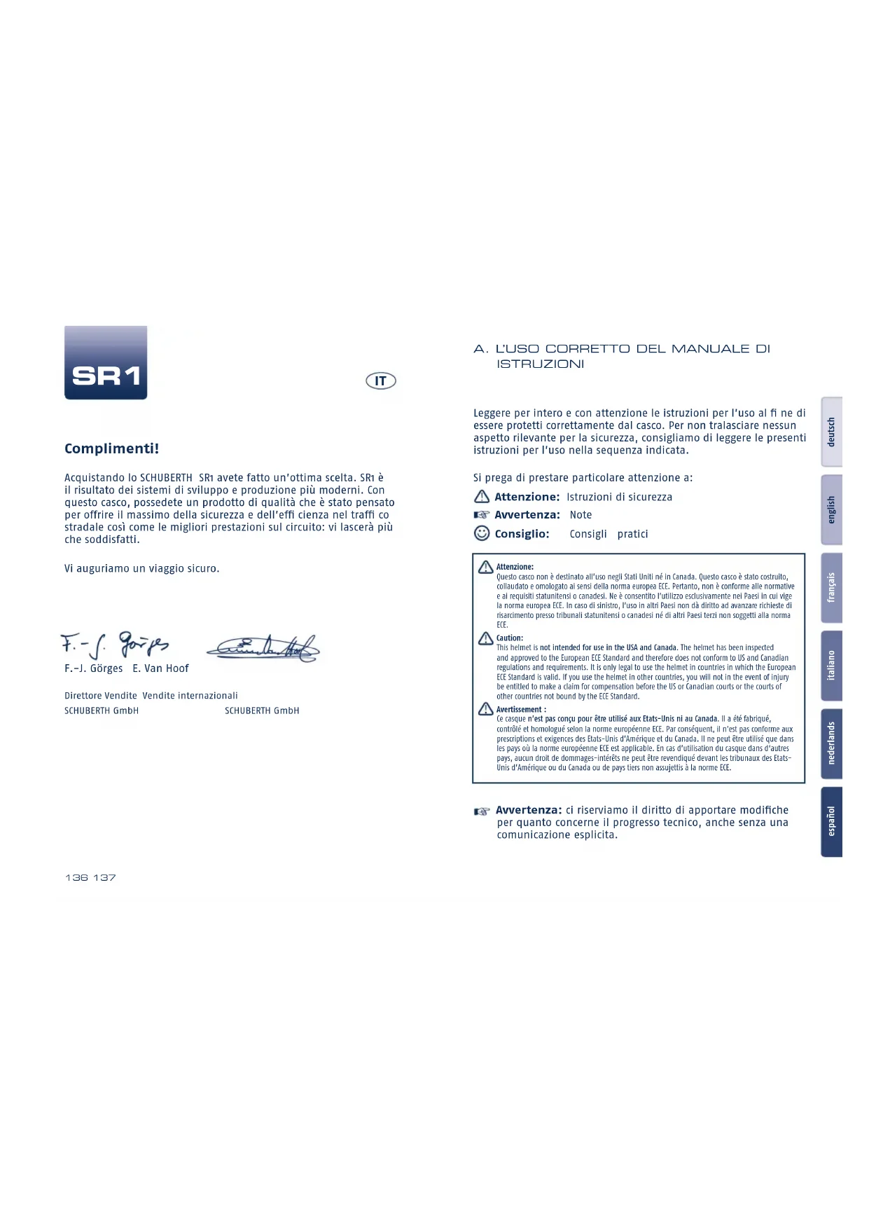 Si vous souhaitez rester informé des dernières nouveautés concernant notre société et notre gamme de casques, vous pouvez vous rendre visite sur www.schuberth.com J. SERVICE SCHUBERTH K. COMMENT NOUS CONTACTER136 137 deutschenglishfrançaisitalianonederlandsespañol Leggere per intero e con attenzione le istruzioni per l’uso al fi ne di essere protetti correttamente dal casco. Per non tralasciare nessun aspetto rilevante per la sicurezza, consigliamo di leggere le presenti istruzioni per l’uso nella sequenza indicata. Si prega di prestare particolare attenzione a: Attenzione: Istruzioni di sicurezza Avvertenza: Note Consiglio: Consigli pratici Attenzione: Questo casco non è destinato all’uso negli Stati Uniti né in Canada. Questo casco è stato costruito, collaudato e omologato ai sensi della norma europea ECE. Pertanto, non è conforme alle normative e ai requisiti statunitensi o canadesi. Ne è consentito l’utilizzo esclusivamente nei Paesi in cui vige la norma europea ECE. In caso di sinistro, l’uso in altri Paesi non dà diritto ad avanzare richieste di risarcimento presso tribunali statunitensi o canadesi né di altri Paesi terzi non soggetti alla norma ECE. Caution: This helmet is not intended for use in the USA and Canada. The helmet has been inspected and approved to the European ECE Standard and therefore does not conform to US and Canadian regulations and requirements. It is only legal to use the helmet in countries in which the European ECE Standard is valid. If you use the helmet in other countries, you will not in the event of injury be entitled to make a claim for compensation before the US or Canadian courts or the courts of other countries not bound by the ECE Standard. Avertissement : Ce casque n’est pas conçu pour être utilisé aux Etats-Unis ni au Canada. Il a été fabriqué, contrôlé et homologué selon la norme européenne ECE. Par conséquent, il n’est pas conforme aux prescriptions et exigences des Etats-Unis d’Amérique et du Canada. Il ne peut être utilisé que dans les pays où la norme européenne ECE est applicable. En cas d’utilisation du casque dans d‘autres pays, aucun droit de dommages-intérêts ne peut être revendiqué devant les tribunaux des Etats-Unis d’Amérique ou du Canada ou de pays tiers non assujettis à la norme ECE. Avvertenza: ci riserviamo il diritto di apportare modifi che per quanto concerne il progresso tecnico, anche senza una comunicazione esplicita. Complimenti! Acquistando lo SCHUBERTH SR1 avete fatto un’ottima scelta. SR1 è il risultato dei sistemi di sviluppo e produzione più moderni. Con questo casco, possedete un prodotto di qualità che è stato pensato per offrire il massimo della sicurezza e dell’effi cienza nel traffi co stradale così come le migliori prestazioni sul circuito: vi lascerà più che soddisfatti. Vi auguriamo un viaggio sicuro. F.-J. Görges E. Van Hoof Direttore Vendite Vendite internazionali SCHUBERTH GmbH SCHUBERTH GmbH A. L’USO CORRETTO DEL MANUALE DI ISTRUZIONI SR1 IT138 139 deutschenglishfrançaisitalianonederlandsespañol G. Per la vostra sicurezza ...................................... 168