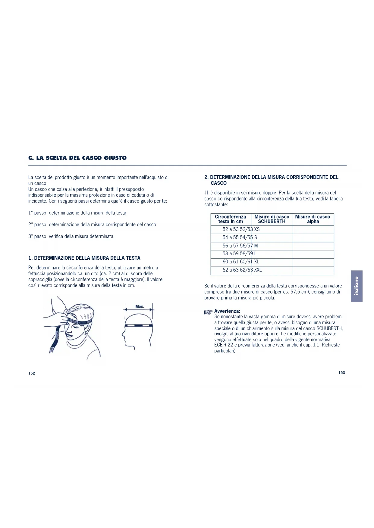 Per determinare la circonferenza della testa, utilizzare un metro a fettuccia posizionandolo ca. un dito (ca. 2 cm) al di sopra delle sopracciglia (dove la circonferenza della testa è maggiore). Il valore così rilevato corrisponde alla misura della testa in cm. Circonferenza testa in cm Misure di casco SCHUBERTH Misure di casco alpha 52 a 53 52/53 XS 54 a 55 54/55 S 56 a 57 56/57 M 58 a 59 58/59 L 60 a 61 60/61 XL 62 a 63 62/63 XXL SH_MAN_J1_10_10_V01_IT_SH05011_Manual_J1_V07_I.qxd 03.11.10 12:58 Seite 152155 italiano