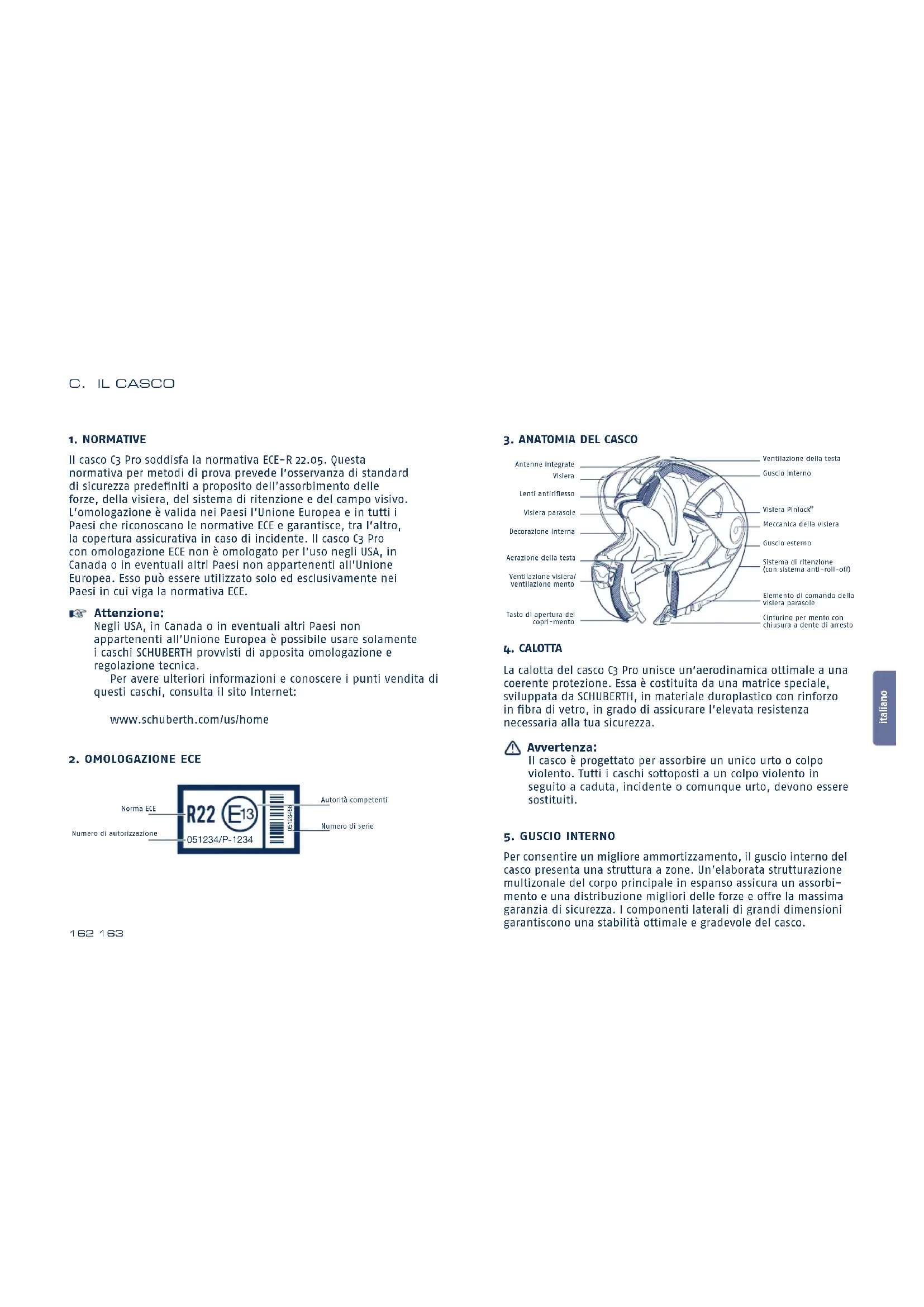 Il casco C3 Pro soddisfa la normativa ECE-R 22.05. Questa normativa per metodi di prova prevede l’osservanza di standard di sicurezza predefiniti a proposito dell’assorbimento delle forze, della visiera, del sistema di ritenzione e del campo visivo. L’omologazione è valida nei Paesi l’Unione Europea e in tutti i Paesi che riconoscano le normative ECE e garantisce, tra l’altro, la copertura assicurativa in caso di incidente. Il casco C3 Pro con omologazione ECE non è omologato per l’uso negli USA, in Canada o in eventuali altri Paesi non appartenenti all’Unione Europea. Esso può essere utilizzato solo ed esclusivamente nei Paesi in cui viga la normativa ECE. Attenzione: Negli USA, in Canada o in eventuali altri Paesi non appartenenti all’Unione Europea è possibile usare solamente i caschi SCHUBERTH provvisti di apposita omologazione e regolazione tecnica. Per avere ulteriori informazioni e conoscere i punti vendita di questi caschi, consulta il sito Internet: www.schuberth.com/us/home