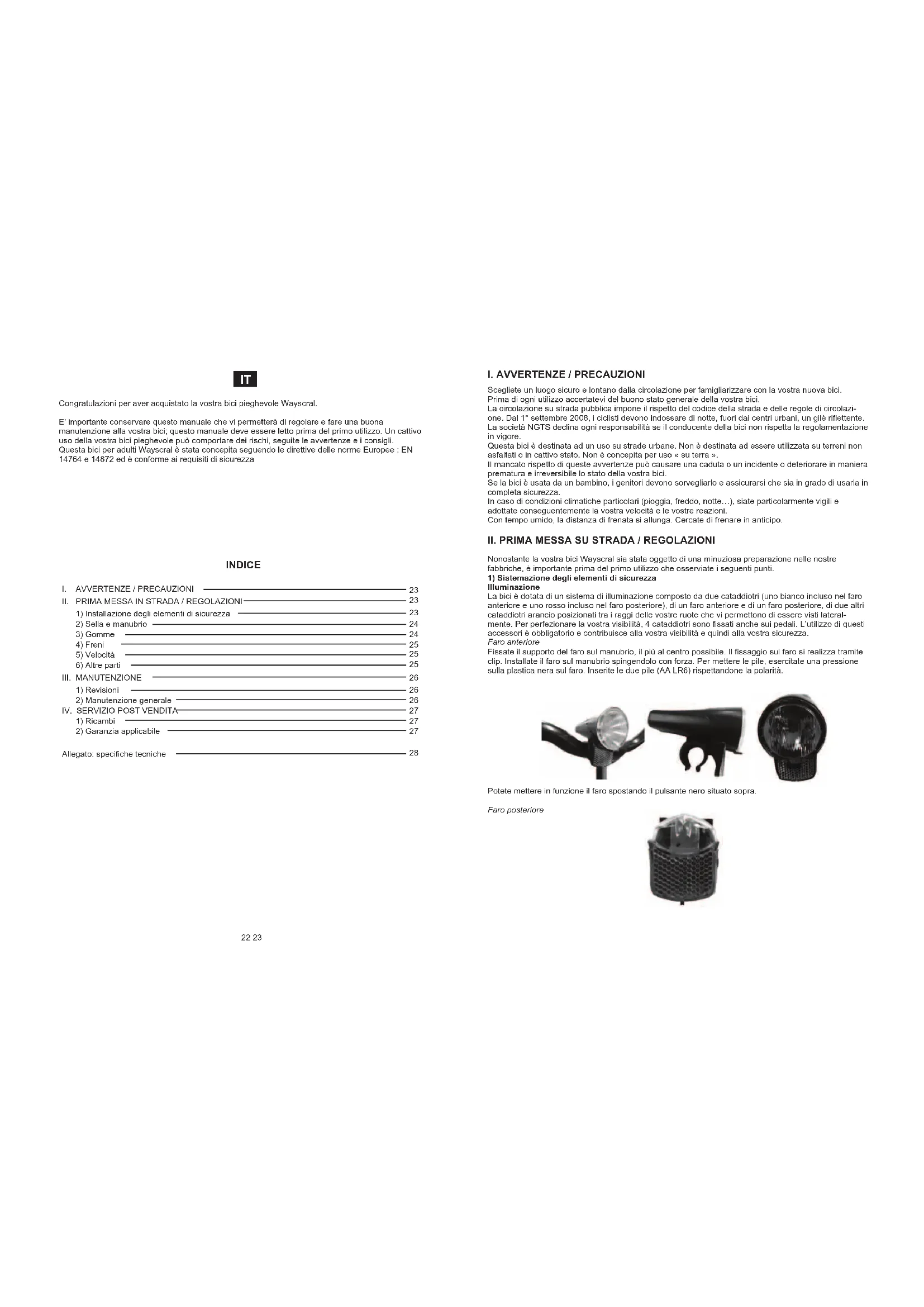 Allegato: specifiche tecniche Congratulazioni per aver acquistato la vostra bici pieghevole Wayscral. E’ importante conservare questo manuale che vi permetterà di regolare e fare una buona manutenzione alla vostra bici; questo manuale deve essere letto prima del primo utilizzo. Un cattivo uso della vostra bici pieghevole può comportare dei rischi, seguite le avvertenze e i consigli. Questa bici per adulti Wayscral è stata concepita seguendo le direttive delle norme Europee : EN 14764 e 14872 ed è conforme ai requisiti di sicurezza