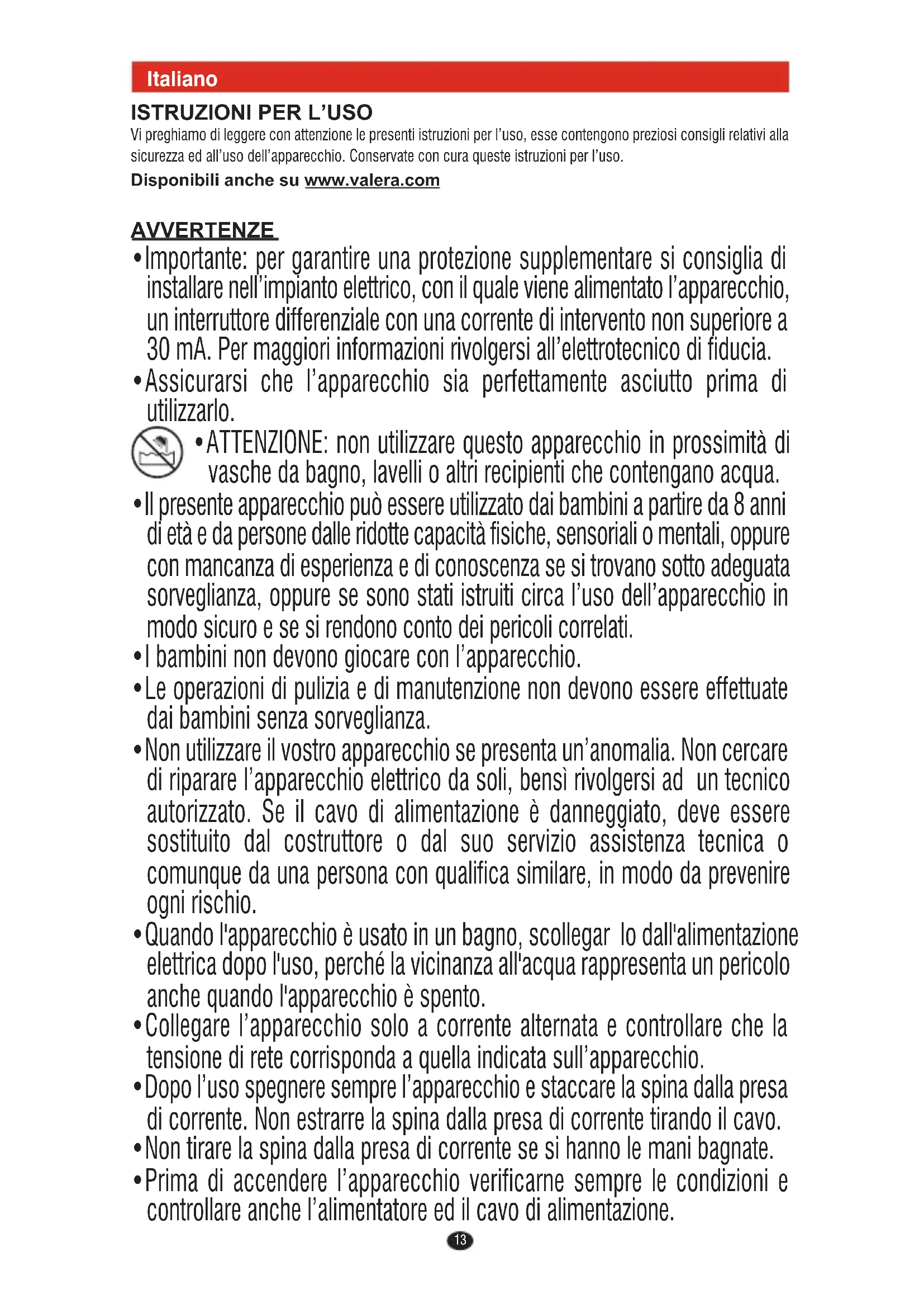 Vi preghiamo di leggere con attenzione le presenti istruzioni per l’uso, esse contengono preziosi consigli relativi alla sicurezza ed all’uso dell’apparecchio. Conservate con cura queste istruzioni per l’uso. Disponibili anche su www.valera.com AVVERTENZE