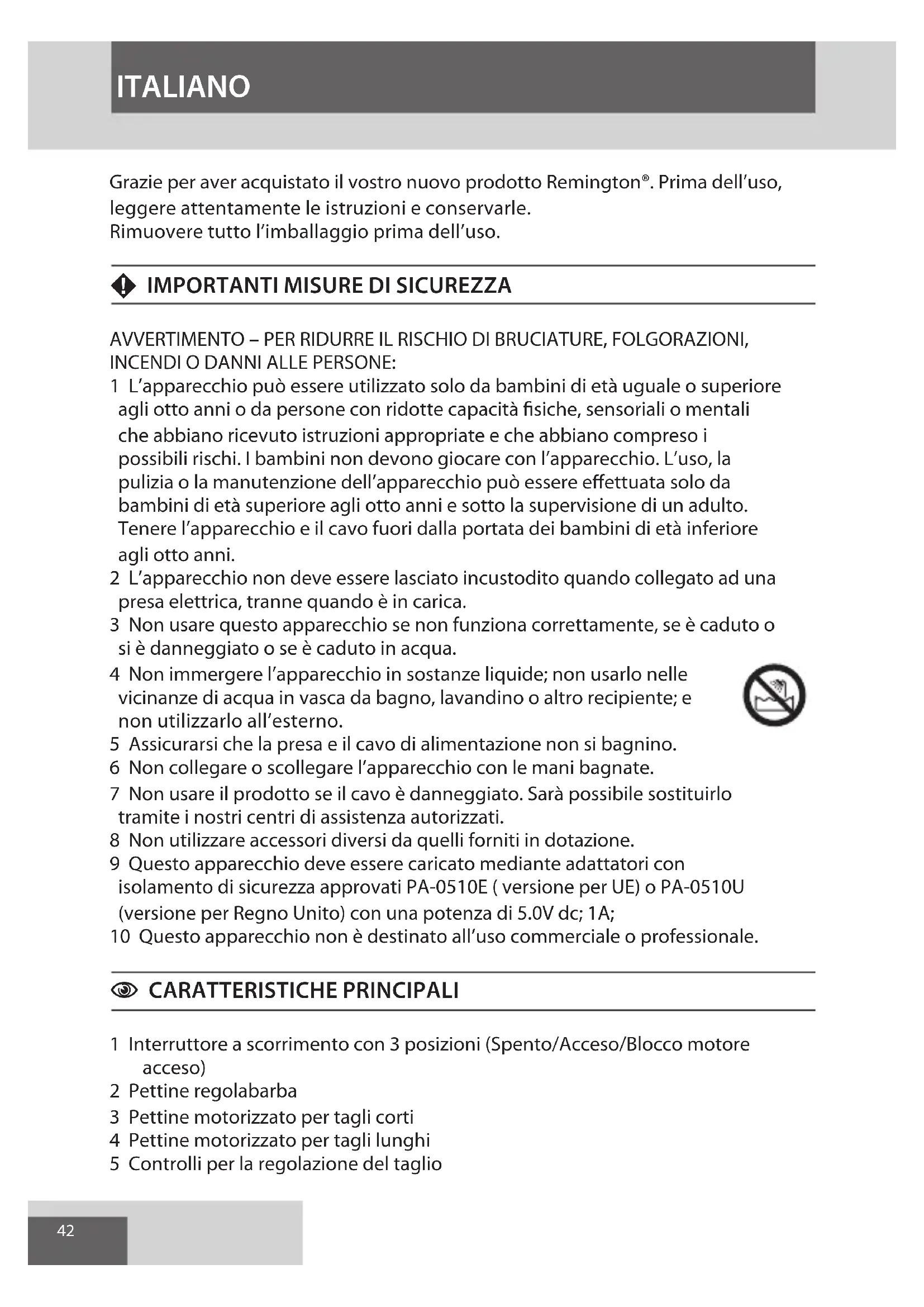 - L'apparecchio funzionera soltanto con il cavo quando è collegato alla rete di alimentazione utilizzando l'adattatore Remington fornito con l'apparecchio, gli altri caricatori USB serviranno solo per caricare l'apparecchio.