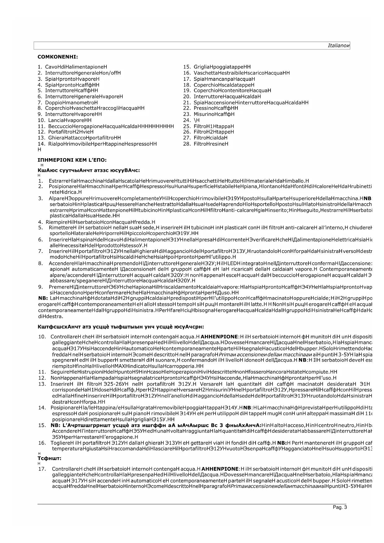 26. Porre un recipiente sotto il beccuccio acqua calda (11) ed alzare l’interruttore acqua calda (20). La spia (21) conferma accensione. Ad ottenimento della quantità desiderata abbassare l’interruttore acqua calda (20) per arrestare l’erogazione. 27. Dopo il prelievo di acqua calda si raccomanda di controllare che il serbatoio interno contenga acqua ed eventualmente di ripristinare il livello come indicato al punto 24. MANUTENZIONE ORDINARIA E PRECAUZIONI: - Si consiglia di pulire il tubo vapore (10) dopo ogni utilizzo. - Per la pulizia della macchina utilizzare un panno umido d’acqua. - Non lasciare l’apparecchio esposto ad agenti atmosferici. - Non immergere l’apparecchio in acqua. - Fare funzionare l’apparecchio soltanto sotto controllo di adulti e tenerlo fuori dalla portata dei bambini. - Non lavare filtri e portafiltro in lavastoviglie. - Durante il normale funzionamento alcune parti della carrozzeria della macchina possono raggiungere temperature elevate: maneggiare con cautela! Nota Bene: La macchina è dotata di un serbatoio d’acqua con una capacità di 2,7l predisposto con rilevatore di mancanza acqua collegato ad una spia allarme (17) ed un buzzer. Il suono del buzzer per segnalare la mancanza dell'acqua al momento dell'accensione della macchina è diverso dal suono emesso per segnalare la mancanza durante il normale funzionamento. Nel caso in cui ci fosse acqua nel serbatoio e il buzzer suonasse comunque, verificare la posizione del serbatoio all’interno della macchina. Il ripristino del livello dell'acqua nel serbatoio determinerà sia lo spegnimento della spia allarme (17) sia l'interruzione del buzzer. Se l'acqua finisce durante il normale funzionamento il rilevatore mancanza acqua consente 15sec. di tempo per fare il caffè; un volta finita l'erogazione del caffè si consiglia di riempire il serbatoio fino al livello max. indicato. Si prega di leggere attentamente le istruzioni d’uso e di controllare periodicamente il livello dell’acqua nel serbatoio interno. Filtro a resine in dotazione (montato sul tubo pescaggio acqua, all'interno del serbatoio): serve a proteggere il meccanismo interno dai depositi di calcare; è un addolcitore usa e getta specifico per macchine da caffè che va cambiato in base a durezza e consumo dell’acqua seguendo le indicazioni nella tabella sotto: Durezza acqua Quantità