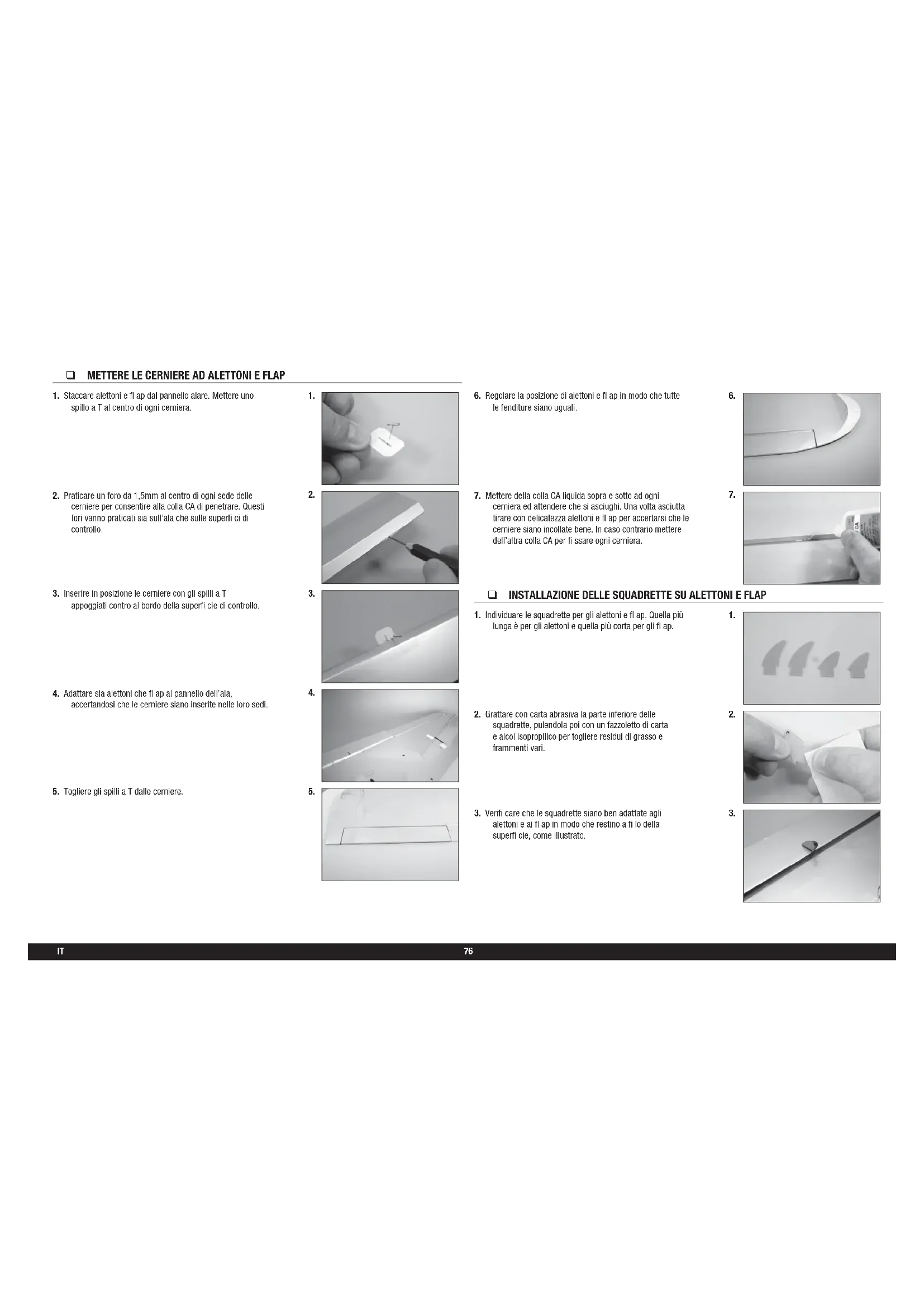 cerniera ed attendere che si asciughi. Una volta asciutta tirare con delicatezza alettoni e fl ap per accertarsi che le cerniere siano incollate bene. In caso contrario mettere dell’altra colla CA per fi ssare ogni cerniera. METTERE LE CERNIERE AD ALETTONI E FLAP