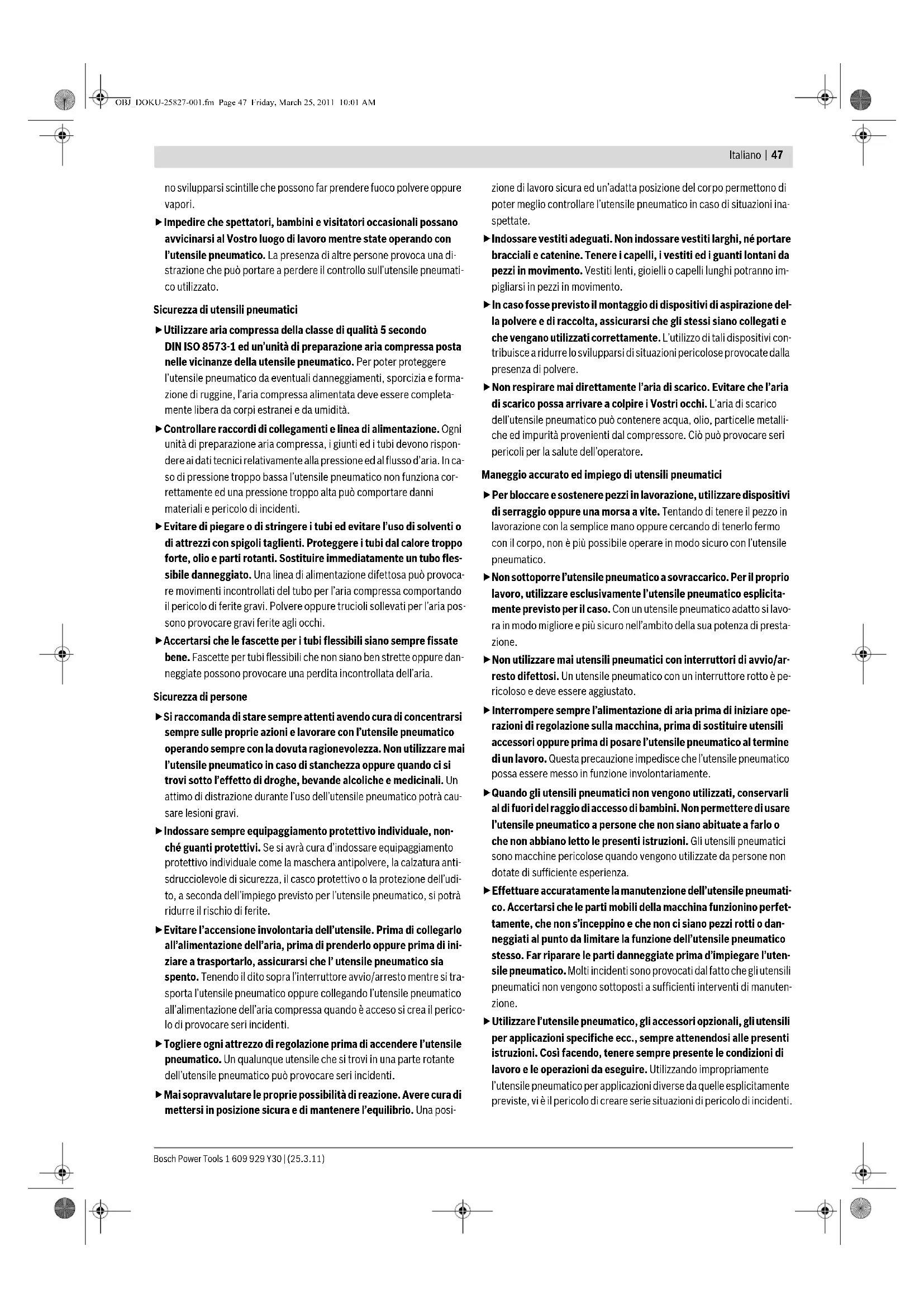 Dr. Egbert Schneider Senior Vice President Engineering Dr. Eckerhard Strötgen Head of Product Certification OBJ_DOKU-25827-001.fm Page 49 Friday, March 25, 2011 10:01 AM1 609 929 Y30 | (25.3.11) Bosch Power Tools 50 | Italiano Montaggio Collegamento all’alimentazione dell’aria (vedi figura A) Assicurarsi che la pressione dell’impianto dell’aria compressa non sia maggiore della pressione nominale massima ammissibile dell’utensile pneumatico. Regolare innanzitutto la pressione dell’aria sul valore inferio- re della pressione nominale consigliata (vedi «Dati tecnici»). In caso di dubbio, controllare con un manometro la pressione all’entrata dell’aria mentre l’utensile pneumatico è acceso. Per il massimo rendimento devono essere rispettati i valori per il tubo fles- sibile dell’aria di alimentazione 13 (filettatura di raccordo, pressione d’esercizio massima, luce diametro interno del tubo flessibile, lunghezza massima del tubo flessibile; vedi «Dati tecnici»). Per poter proteggere l’utensile pneumatico da eventuali danneggiamenti, sporcizia e formazione di ruggine, l’aria compressa alimentata deve esse- re completamente libera da corpi estranei e da umidità. Tutti gli strumenti, le tubazioni di collegamento ed i tubi devono essere adatti alla rispettiva pressione ed alla quantità di aria necessaria. Evitare ogni restringimento dei tubi di alimentazione, p.es. tramite schiacciamenti, piegature oppure strappi! Raccordo dell’alimentazione dell’aria all’utensile pneumatico – Svuotare il caricatore 8. (vedi «Svuotare il caricatore», pagina 51) Nelle operazioni sotto indicate è possibile l’espulsione di un elemento di fissaggio se, a causa di interventi di riparazione e di manutenzione oppure in caso di trasporto, parti interne dell’utensile pneumatico non si trovano in posizione iniziale. – Collegare il raccordo per l’aria 6 con un tubo dell’aria di alimentazione 13 dotato di un innesto rapido 12. – Controllare il perfetto funzionamento applicando l’utensile pneumatico con il foro di espulsione 11 oppure ev. con la protezione gommata per il pezzo in lavorazione 1 su un pezzo di legno residuo oppure su un ma- teriale di legno ed azionare una o due volte. Ricaricare il caricatore (vedi figure B1–B2) Interrompere sempre l’alimentazione di aria prima di iniziare operazioni di regolazione sulla macchina, pri- ma di sostituire utensili accessori oppure prima di po- sare l’utensile pneumatico al termine di un lavoro. Que- sta precauzione impedisce che l’utensile pneumatico possa essere messo in funzione involontariamente. fUtilizzare esclusivamente accessori originali Bosch (vedi «Dati tecnici»). I componenti di precisione dell’utensile pneumatico come caricatore, bocca e canale di espulsione sono adattati a graffe, chiodi e punte della Bosch. Altri produttori utilizzano qualità di acciaio e dimen- sioni diverse. L’impiego di elementi di fissaggio non ammessi può danneggiare l’uten- sile pneumatico e causare lesioni. Durante il caricamento del caricatore tenere l’utensile pneumatico in mo- do tale che la bocca 11 non sia rivolta né verso il proprio corpo né in dire- zione di altre persone. – Tirare indietro il cursore del caricatore 7 fino a quando lo stesso scatta in posizione posteriore. Nota bene: Il cursore del caricatore deve poter essere spinto indietro senza l'impiego di eccessiva forza (solo con la forza del dito). Un cursore del caricatore che scorre a fatica causa l'espulsione dei chiodi con un an- golo non corretto. – In caso di necessità pulire e lubrificare il cursore del caricatore 7 ed as- sicurarsi che il caricatore 8 non sia sporco. – Inserire un nastro di chiodi 14 adatto. Non utilizzare alcun nastro di chiodi che contenga meno di 5 chiodi. Non inserire più di 2 nastri di chiodi. Assicurarsi che le teste dei chiodi non si sovrappongano. GSN 90-34 DK: In questo utensile pneumatico un blocco del cursore del caricatore impedisce che gli ultimi chiodi vengano espulsi. Ca. 7 chiodi ri- mangono nel caricatore. – Tirare ancora una volta completamente indietro il cursore del caricato- re 7 per allentare il blocco. – Condurre con cautela in avanti il cursore del caricatore fino a quando lo stesso tocca il nastro di chiodi. Effettuando questa operazione assicurarsi che il cursore del caricatore sia spinto sopra la testa dell'ultimo chiodo. Nota bene: Non permettere che il cursore del caricatore scatti indietro senza essere condotto. Durante questo movimento il cursore del carica- tore potrebbe danneggiarsi ed esiste il pericolo che possano rimanere in- castrate le dita. Uso Sistemi di disinnesto L’utensile pneumatico può essere fatto funzionare con due diversi sistemi di disinnesto. – Disinnesto singolo con sicura contro sequenza Con questo sistema di disinnesto deve essere applicata innanzitutto la sicura contro il disinnesto 2 in modo saldo sul pezzo in lavorazione. Un elemento di fissaggio viene espulso solamente poi premendo il disposi- tivo di disinnesto 10. Successivamente possono essere effettuati ulteriori colpi solamente se il dispositivo di disinnesto e la sicura contro il disinnesto sono stati riportati precedentemente nella posizione iniziale. – Disinnesto a contatto Con questo sistema di disinnesto deve essere premuto innanzitutto il dispositivo di disinnesto 10. Un elemento di fissaggio viene espulso poi sempre se, con dispositivo di disinnesto premuto, la sicura contro di- sinnesto 2 viene applicata in modo saldo sul pezzo in lavorazione. In questo modo viene ottenuta un elevata velocità di lavoro. Per la regolazione del sistema di disinnesto è necessario l'impiego del commutatore 9. Avviamento Interrompere sempre l’alimentazione di aria prima di iniziare operazioni di regolazione sulla macchina, pri- ma di sostituire utensili accessori oppure prima di po- sare l’utensile pneumatico al termine di un lavoro. Que- sta precauzione impedisce che l’utensile pneumatico possa esser