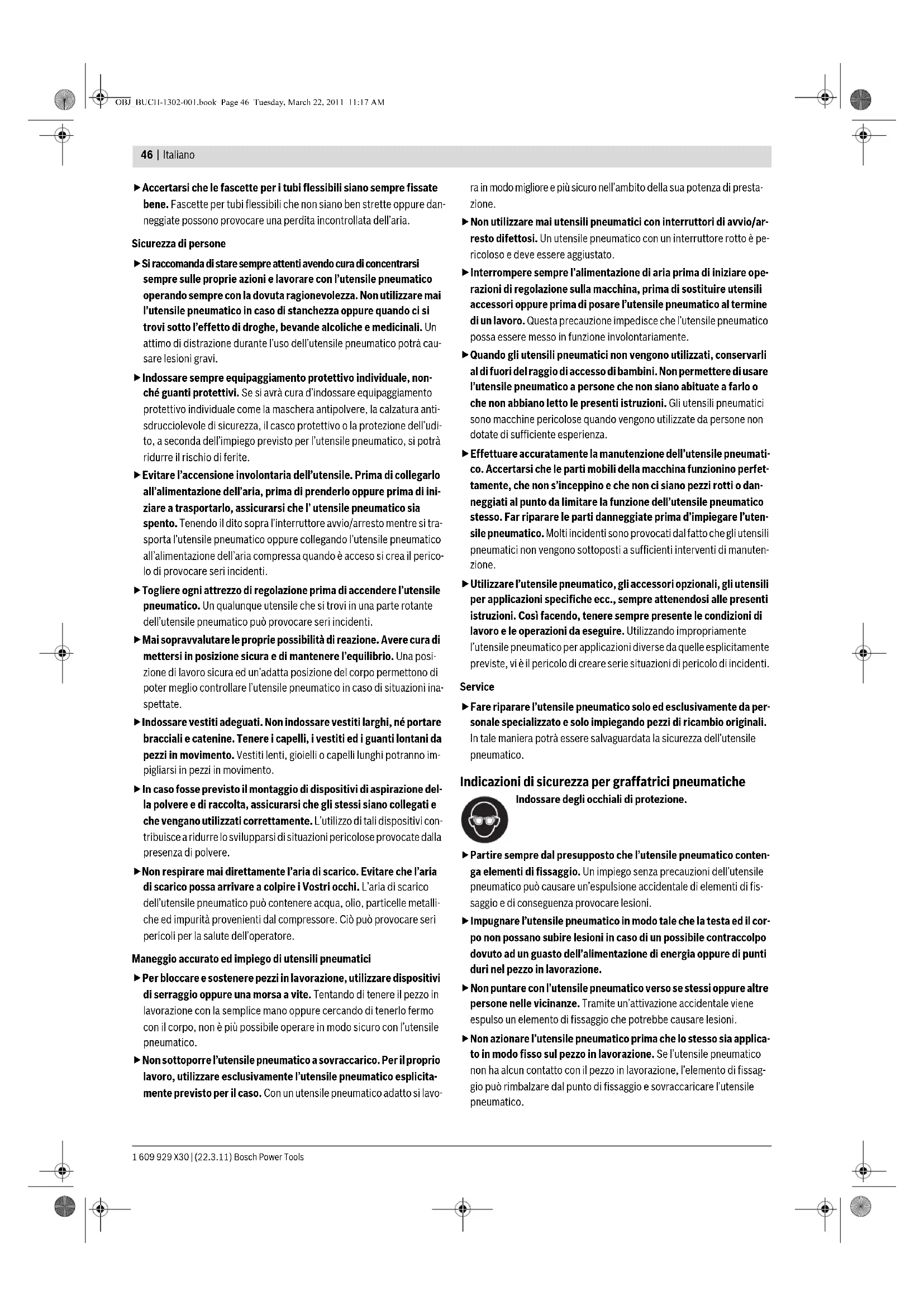Peso in funzione della EPTA-Procedure 01/2003 kg 1,86 Dr. Egbert Schneider Senior Vice President Engineering Dr. Eckerhard Strötgen Head of Product Certification Graffatrice pneumatica GSK 64-34 Professional OBJ_BUCH-1302-001.book Page 48 Tuesday, March 22, 2011 11:17 AMItaliano | 49 Bosch Power Tools 1 609 929 X30 | (22.3.11) – Portare con cautela in avanti il cursore del caricatore 11 con trascina- tore chiodi 18 premuto fino a quando il trascinatore chiodi è introdotto sopra l'ultimo chiodo e spingere in questo modo completamente in avanti il nastro di chiodi nel caricatore. Nota bene: Non permettere che il cursore del caricatore scatti indietro senza essere condotto. Durante questo movimento il cursore del carica- tore potrebbe danneggiarsi ed esiste il pericolo che possano rimanere in- castrate le dita. Uso Sistemi di disinnesto L’utensile pneumatico può essere fatto funzionare con due diversi sistemi di disinnesto. – Disinnesto singolo con sicura contro sequenza Con questo sistema di disinnesto deve essere applicata innanzitutto la sicura contro il disinnesto 2 in modo saldo sul pezzo in lavorazione. Un elemento di fissaggio viene espulso solamente poi premendo il disposi- tivo di disinnesto 5. Successivamente possono essere effettuati ulteriori colpi solamente se il dispositivo di disinnesto e la sicura contro il disinnesto sono stati riportati precedentemente nella posizione iniziale. – Disinnesto a contatto Con questo sistema di disinnesto deve essere premuto innanzitutto il dispositivo di disinnesto 5. Un elemento di fissaggio viene espulso poi sempre se, con dispositivo di disinnesto premuto, la sicura contro di- sinnesto 2 viene applicata in modo saldo sul pezzo in lavorazione. In questo modo viene ottenuta un elevata velocità di lavoro. Per la regolazione del sistema di disinnesto è necessario l'impiego del commutatore 6. Avviamento Interrompere sempre l’alimentazione di aria prima di iniziare operazioni di regolazione sulla macchina, pri- ma di sostituire utensili accessori oppure prima di po- sare l’utensile pneumatico al termine di un lavoro. Que- sta precauzione impedisce che l’utensile pneumatico possa essere messo in funzione involontariamente. Lavori con disinnesto singolo (vedi figura C) – Premere il commutatore 6 verso l'interno ed inclinarlo contemporane- amente nella posizione inferiore fino a quando lo stesso scatta in posi- zione. Il sistema «disinnesto singolo» è regolato. – Applicare il foro di espulsione 13 oppure ev. la protezione gommata per il pezzo in lavorazione 1 saldamente sul pezzo in lavorazione fino a quando la sicura contro il disinnesto 2 è completamente premuta. – Successivamente premere brevemente il dispositivo di disinnesto 5 e rilasciarlo di nuovo. Contemporaneamente viene espulso un chiodo. – Lasciare che l’utensile pneumatico rimbalzi dal pezzo in lavorazione. – Per un’ulteriore colpo sollevare completamente l’utensile pneumatico dal pezzo in lavorazione ed applicarlo di nuovo saldamente sul succes- sivo punto desiderato. Lavori con disinnesto a contatto (vedi figura D) – Premere il commutatore 6 verso l'interno ed inclinarlo contemporane- amente nella posizione superiore fino a quando lo stesso scatta in posi- zione. Il sistema «disinnesto a contatto» è regolato. – Premere il dispositivo di disinnesto 5 e tenerlo premuto. – Applicare il foro di espulsione 13 oppure ev. la protezione gommata per il pezzo in lavorazione 1 saldamente sul pezzo in lavorazione fino a quando la sicura contro il disinnesto 2 è completamente premuta. Contemporaneamente viene espulso un chiodo. – Lasciare che l’utensile pneumatico rimbalzi dal pezzo in lavorazione. – Per un’ulteriore colpo sollevare completamente l’utensile pneumatico dal pezzo in lavorazione ed applicarlo di nuovo saldamente sul succes- sivo punto desiderato. – Muovere l’utensile pneumatico uniformemente sollevandolo ed appli- candolo di nuovo sul pezzo in lavorazione. Ogni volta che l’utensile pneumatico viene applicato e la sicura contro il disinnesto è premuta, viene espulso un chiodo. – Non appena è stato espulso il numero desiderato di chiodi, rilasciare di nuovo il dispositivo di disinnesto 5. Indicazioni operative Interrompere sempre l’alimentazione di aria prima di iniziare operazioni di regolazione sulla macchina, pri- ma di sostituire utensili accessori oppure prima di po- sare l’utensile pneumatico al termine di un lavoro. Que- sta precauzione impedisce che l’utensile pneumatico possa essere messo in funzione involontariamente. Prima dell’inizio di ogni lavoro controllare il perfetto funzionamento dei di- spositivi di sicurezza e dei dispositivi di disinnesto nonché la sede fissa di tutte le viti e dadi. Staccare immediatamente dall’alimentazione dell’aria un utensile pneu- matico difettoso oppure che non lavora correttamente e contattare un centro di assistenza clienti autorizzato Bosch. Non effettuare alcuna manipolazione irregolare sull’utensile pneumatico. Non smontare oppure bloccare alcun componente dell’utensile pneuma- tico, come ad es. la sicura contro disinnesto. Non effettuare «riparazioni d’emergenza» con mezzi non adatti. L’utensile pneumatico deve essere sottoposto regolarmente e correttamente a ma- nutenzione (vedi «Manutenzione e pulizia», pagina 50). Evitare qualsiasi indebolimento e danneggiamento dell’utensile pneuma- tico, p. es. tramite: – martellamento oppure incisione, – interventi di modifica non autorizzati dal produttore, – conduzione su sagome che sono prodotte in materiale duro, p.es. ac- ciaio, – caduta su pavimento oppure spostamento sopra il pavimento, – utilizzo come martello, – qualsiasi tipo di azioni di forza. Assicurarsi relativamente a cosa si trova sotto o dietro il pezzo in lavora- zione. Non sparare chiodi in pareti, soffitti oppure pavimenti se dietro vi sono delle persone. I chiodi possono passare attraverso il pezzo in lavora- zione e fer