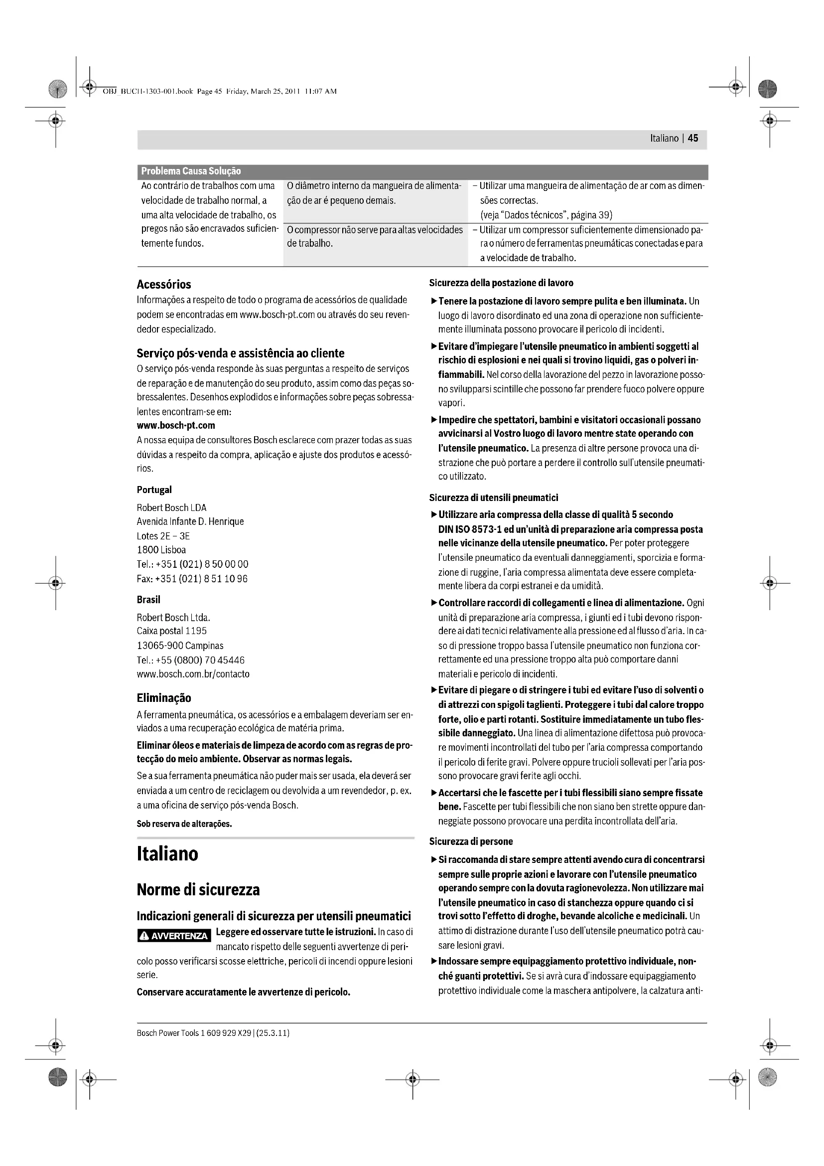 Evita o emperramento de um prego. – Soprar o mecanismo do carregador/do gan- cho de alimentação diariamente com ar com- primido. Assegure-se de que a protecção contra disparo 10 esteja funcionando correctamente. Promove a segurança de trabalho e uma aplica- ção eficiente da ferramenta pneumática. – Soprar o mecanismo da protecção contra dis- paro diariamente com ar comprimido. Lubrificar a ferramenta pneumática. Reduz o desgaste da ferramenta pneumática. – Aplicar 2–3 gotas de lubrificante na peça de conexão de ar 3. (veja “Lubrificar a ferramenta pneumática”, página 43) Esvaziar o compressor. Evita o acúmulo de sujidade e de humidade den- tro da ferramenta pneumática. – Abrir a válvula de descarga do tanque do com- pressor. Problema Causa Solução A ferramenta pneumática está pron- ta para funcionar, mas não são atira- dos pregos. Um prego está emperrado no canal de tiro. – Soltar o emperramento. (veja “Soltar emperramentos”, página 42) A alimentação dos pregos está bloqueada. – Limpar e lubrificar o gancho de alimentação 22 sempre que for necessário e assegure-se de que o carregador 6 não es- teja sujo. A mola do gancho de alimentação 22 é fraca demais ou está com defeito. – Entre em contacto com um posto de serviço pós-venda da Bosch. Permita que a peça seja substituída. Os elementos fixadores utilizados são inadmis- síveis. – Só utilizar acessórios originais. Só devem ser utilizados os elementos fixadores (pregos, agrafos, etc.) especificados na tabela “Dados técnicos”. O carregador 6 está vazio. – Encher novamente o carregador. (veja “Carregar o carregador”, página 41) OBJ_BUCH-1303-001.book Page 43 Friday, March 25, 2011 11:07 AM1 609 929 X29 | (25.3.11) Bosch Power Tools 44 | Português Os pregos só são atirados muito len- tamente e com pressão baixa de- mais. A pressão nominal da alimentação de ar com- primido é baixa demais. – A alimentação de ar comprimido deve ser aumentada. Não devem ser ultrapassados 8 bar. O punção está danificado. – Só utilizar os lubrificantes recomendados pela Bosch. (veja “Lubrificar a ferramenta pneumática”, página 43) O anel de vedação do êmbolo está gasto ou da- nificado. – Entre em contacto com um posto de serviço pós-venda da Bosch. Permita que a peça seja substituída. O buffer está gasto. – Entre em contacto com um posto de serviço pós-venda da Bosch. Permita que a peça seja substituída. O comprimento e o diâmetro da mangueira de alimentação de ar 13 não correspondem às es- pecificações para esta ferramenta pneumática. – Utilizar uma mangueira de alimentação de ar com as dimen- sões correctas. (veja “Dados técnicos”, página 39) A mangueira de alimentação de ar 13 está do- brada. – Remover a dobra da mangueira de alimentação de ar. Os pregos são encravados fundos demais. A pressão nominal da alimentação de ar com- primido é alta demais. – A alimentação de ar comprimido deve ser reduzida. Não de- vem ser menos do que 5 bar. O ajuste do esbarro de profundidade é baixo demais. – Ajustar o esbarro de profundidade na profundidade deseja- da. (veja “Ajustar o esbarro de profundidade”, página 42) O buffer está gasto. – Entre em contacto com um posto de serviço pós-venda da Bosch. Permita que a peça seja substituída. Os pregos não são encravados sufi- cientemente fundos. A pressão nominal da alimentação de ar com- primido é baixa demais. – A alimentação de ar comprimido deve ser aumentada. Não devem ser ultrapassados 8 bar. O ajuste do esbarro de profundidade é alto de- mais. – Ajustar o esbarro de profundidade na profundidade deseja- da. (veja “Ajustar o esbarro de profundidade”, página 42) O comprimento e o diâmetro da mangueira de alimentação de ar 13 não correspondem às es- pecificações para esta ferramenta pneumática. – Utilizar uma mangueira de alimentação de ar com as dimen- sões correctas. (veja “Dados técnicos”, página 39) A mangueira de alimentação de ar 13 está do- brada. – Remover a dobra da mangueira de alimentação de ar. A ferramenta pneumática salta por um prego ou tem um avanço de inter- valo grande demais. Os elementos fixadores utilizados são inadmis- síveis. – Só utilizar acessórios originais. Só devem ser utilizados os elementos fixadores (pregos, agrafos, etc.) especificados na tabela “Dados técnicos”. O carregador 6 não funciona correctamente. – Limpar e lubrificar o gancho de alimentação 22 sempre que for necessário e assegure-se de que o carregador 6 não es- teja sujo. A mola do gancho de alimentação 22 é fraca demais ou está com defeito. – Entre em contacto com um posto de serviço pós-venda da Bosch. Permita que a peça seja substituída. O anel de vedação do êmbolo está gasto ou da- nificado. – Entre em contacto com um posto de serviço pós-venda da Bosch. Permita que a peça seja substituída. Os pregos emperram frequentemen- te no canal de tiro. Os elementos fixadores utilizados são inadmis- síveis. – Só utilizar acessórios originais. Só devem ser utilizados os elementos fixadores (pregos, agrafos, etc.) especificados na tabela “Dados técnicos”. – Entre em contacto com um posto de serviço pós-venda da Bosch. Os pregos cravados estão tortos. O punção está danificado. – Entre em contacto com um posto de serviço pós-venda da Bosch. Permita que a peça seja substituída. Problema Causa Solução OBJ_BUCH-1303-001.book Page 44 Friday, March 25, 2011 11:07 AMItaliano | 45 Bosch Power Tools 1 609 929 X29 | (25.3.11) Acessórios Informações a respeito de todo o programa de acessórios de qualidade podem se encontradas em www.bosch-pt.com ou através do seu reven- dedor especializado. Serviço pós-venda e assistência ao cliente O serviço pós-venda responde às suas perguntas a respeito de serviços de reparação e de manutenção do seu produto, assim co