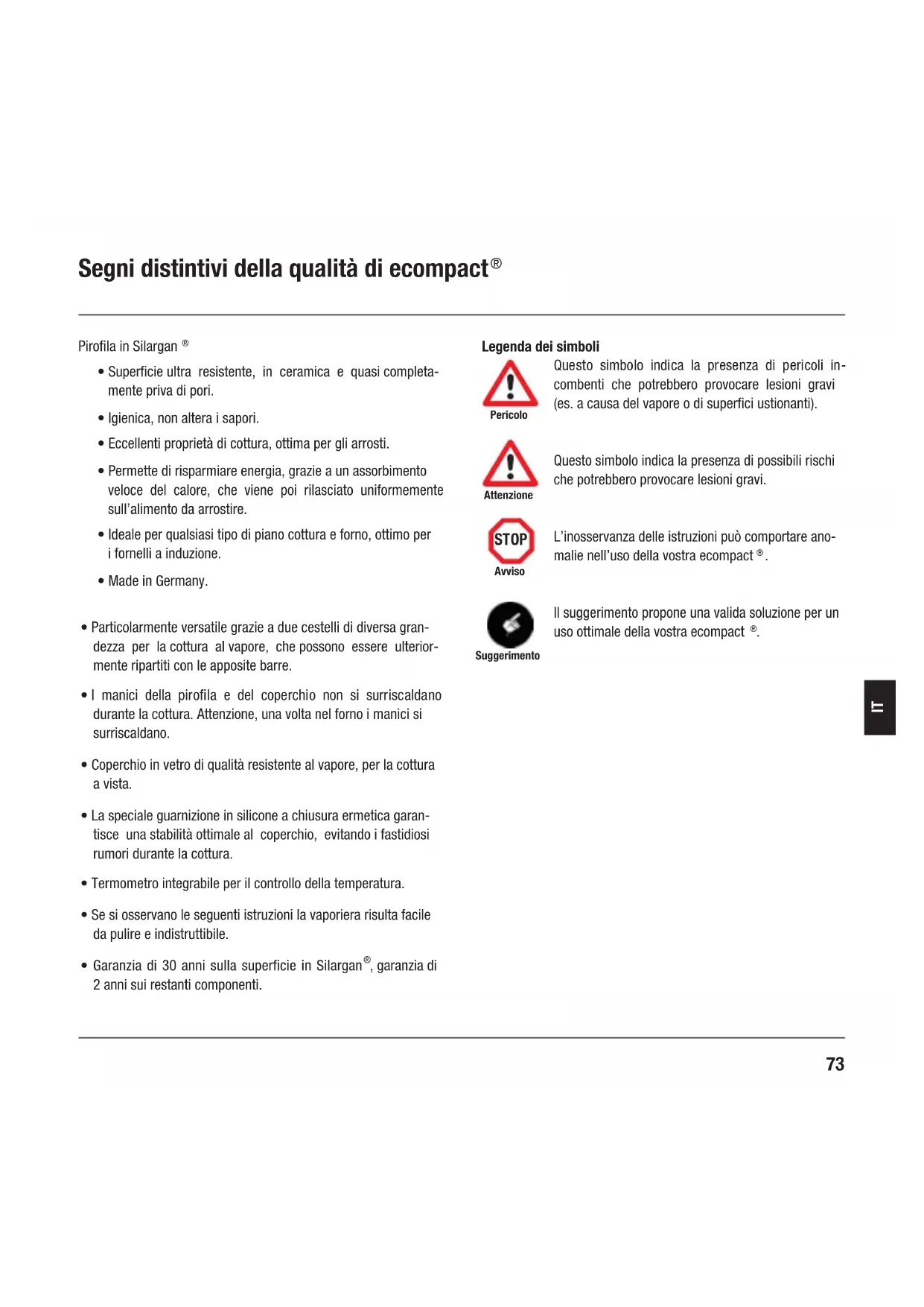 - Durante l'uso non toccare le superfi ci esterne calde di ecompact® oppure i manici dei cestelli, ma afferrare solo i manici della pirofi la o del coperchio. Se necessario, servirsi di presine, ecc.