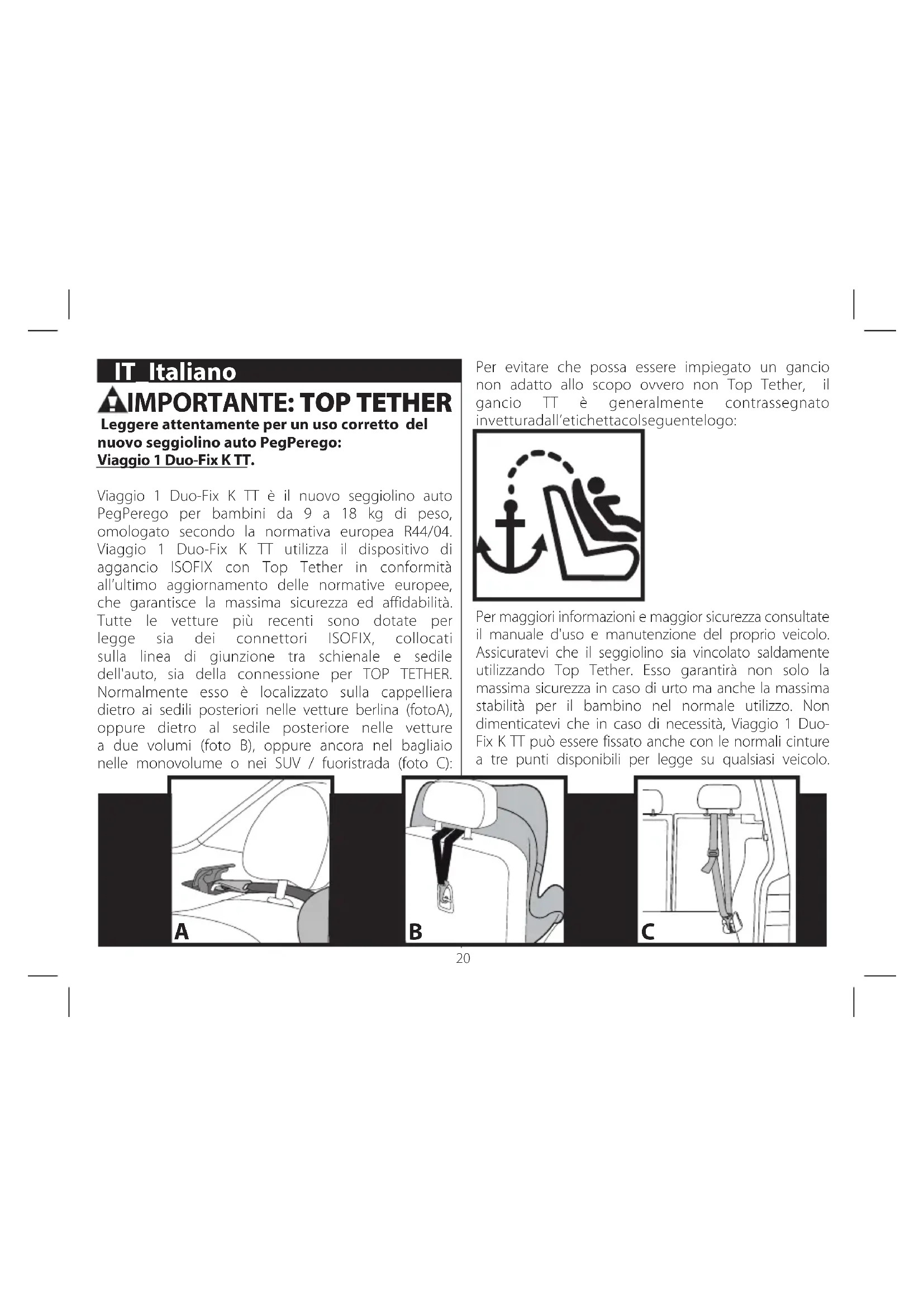 Leggere attentamente per un uso corretto del nuovo seggiolino auto PegPerego: Viaggio 1 Duo-Fix K TT. Viaggio 1 Duo-Fix K TT è il nuovo seggiolino auto PegPerego per bambini da 9 a 18 kg di peso, omologato secondo la normativa europea R44/04. Viaggio 1 Duo-Fix K TT utilizza il dispositivo di aggancio ISOFIX con Top Tether in conformità all’ultimo aggiornamento delle normative europee, che garantisce la massima sicurezza ed affidabilità. Tutte le vetture più recenti sono dotate per legge sia dei connettori ISOFIX, collocati sulla linea di giunzione tra schienale e sedile dell'auto, sia della connessione per TOP TETHER. Normalmente esso è localizzato sulla cappelliera dietro ai sedili posteriori nelle vetture berlina (fotoA), oppure dietro al sedile posteriore nelle vetture a due volumi (foto B), oppure ancora nel bagliaio nelle monovolume o nei SUV / fuoristrada (foto C): BA C IT_Italiano Grazie per aver scelto un prodotto Peg-Pérego. Caratteristiche prodotto Seggiolino-auto, Gruppo 1, categoria “Universale”con cinture