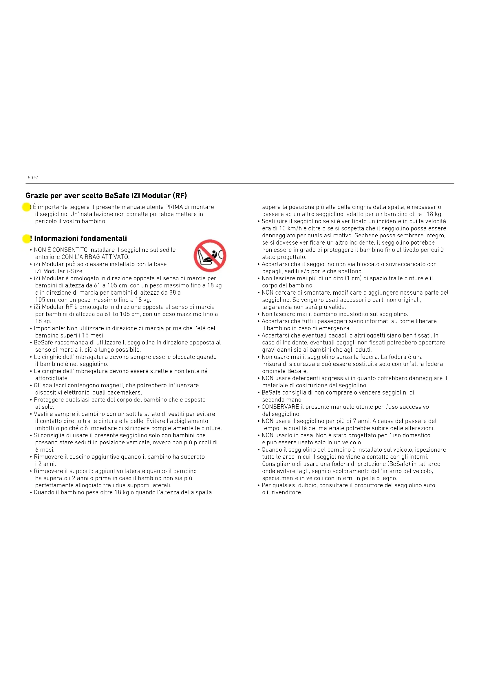 - Quando il bambino pesa oltre 18 kg o quando l’altezza della spalla Grazie per aver scelto BeSafe iZi Modular (RF) ! È importante leggere il presente manuale utente PRIMA di montare il seggiolino. Un’installazione non corretta potrebbe mettere in pericolo il vostro bambino. supera la posizione più alta delle cinghie della spalla, è necessario passare ad un altro seggiolino, adatto per un bambino oltre i 18 kg.