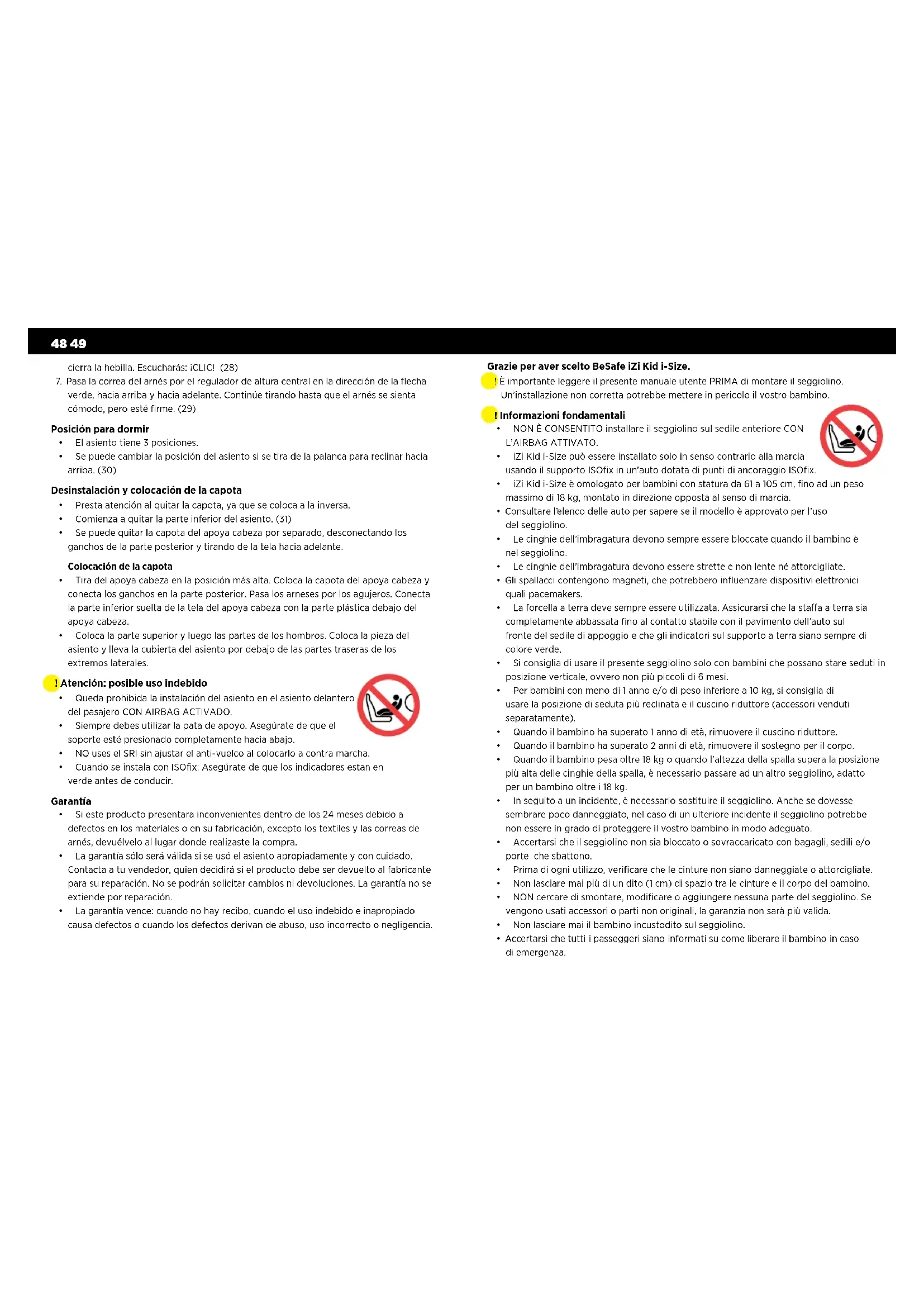 - Accertarsi che tutti i passeggeri siano informati su come liberare il bambino in caso di emergenza. Grazie per aver scelto BeSafe iZi Kid i-Size. ! È importante leggere il presente manuale utente PRIMA di montare il seggiolino. Un’installazione non corretta potrebbe mettere in pericolo il vostro bambino.