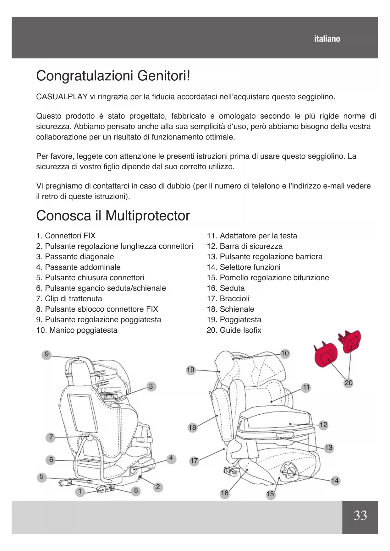 Congratulazioni Genitori! CASUALPLAY vi ringrazia per la ducia accordataci nell’acquistare questo seggiolino. Questo prodotto è stato progettato, fabbricato e omologato secondo le più rigide norme di sicurezza. Abbiamo pensato anche alla sua semplicità d‘uso, però abbiamo bisogno della vostra collaborazione per un risultato di funzionamento ottimale. Per favore, leggete con attenzione le presenti istruzioni prima di usare questo seggiolino. La sicurezza di vostro glio dipende dal suo corretto utilizzo. Vi preghiamo di contattarci in caso di dubbio (per il numero di telefono e l’indirizzo e-mail vedere il retro di queste istruzioni). Conosca il Multiprotector
