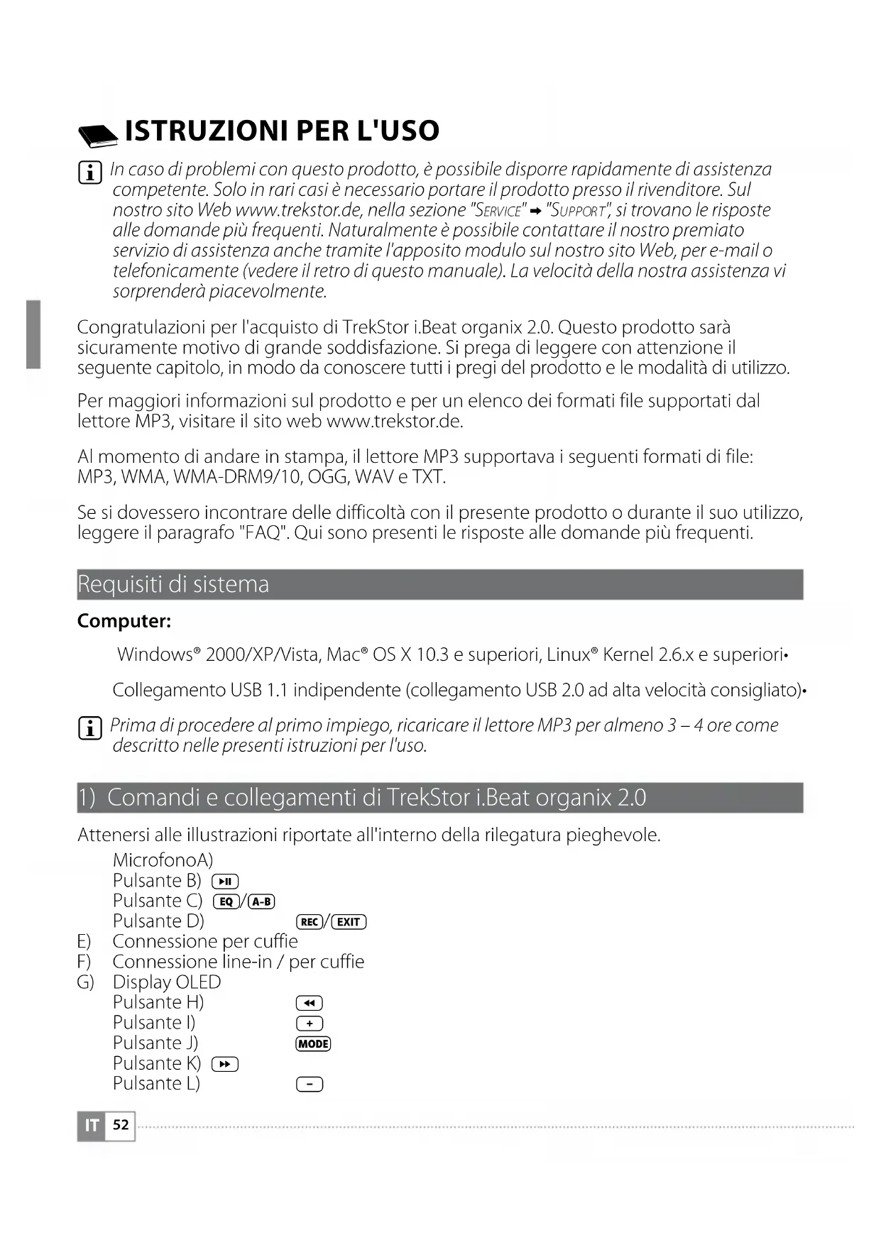 In caso di problemi con questo prodotto, è possibile disporre rapidamente di assistenza competente. Solo in rari casi è necessario portare il prodotto presso il rivenditore. Sul nostro sito Web www.trekstor.de, nella sezione "Se r v i c e " + "Su p p o r t ", si trovano le risposte alle domande più frequenti. Naturalmente è possibile contattare il nostro premiato servizio di assistenza anche tramite l'apposito modulo sul nostro sito Web, per e-mail o telefonicamente (vedere il retro di questo manuale). La velocità della nostra assistenza vi sorprenderà piacevolmente. Congratulazioni per l'acquisto di TrekStor i.Beat organix 2.0. Questo prodotto sarà sicuramente motivo di grande soddisfazione. Si prega di leggere con attenzione il seguente capitolo, in modo da conoscere tutti i pregi del prodotto e le modalità di utilizzo. Per maggiori informazioni sul prodotto e per un elenco dei formati file supportati dal lettore MP3, visitare il sito web www.trekstor.de. Al momento di andare in stampa, il lettore MP3 supportava i seguenti formati di file: MP3, WMA, WMA-DRM9/10, OGG, WAV e TXT. Se si dovessero incontrare delle difficoltà con il presente prodotto o durante il suo utilizzo, leggere il paragrafo "FAQ". Qui sono presenti le risposte alle domande più frequenti. Requisiti di sistema Computer: Windows® 2000/XP/Vista, Mac® OS X 10.3 e superiori, Linux® Kernel 2.6.x e superiori• Collegamento USB 1.1 indipendente (collegamento USB 2.0 ad alta velocità consigliato)•