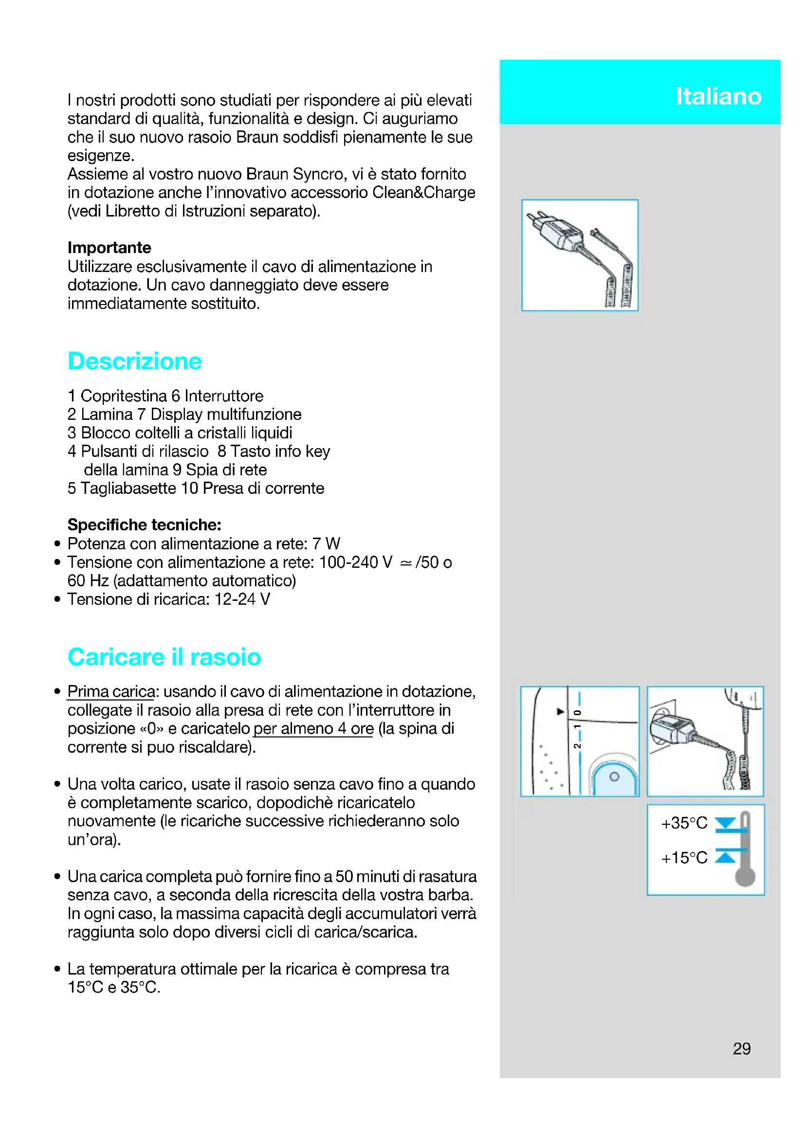 5491458_S 4-78 Seite 28 Freitag, 7. April 2000 9:37 0929 I nostri prodotti sono studiati per rispondere ai più elevati standard di qualità, funzionalità e design. Ci auguriamo che il suo nuovo rasoio Braun soddisfi pienamente le sue esigenze. Assieme al vostro nuovo Braun Syncro, vi è stato fornito in dotazione anche l’innovativo accessorio Clean&Charge (vedi Libretto di Istruzioni separato). Importante Utilizzare esclusivamente il cavo di alimentazione in dotazione. Un cavo danneggiato deve essere immediatamente sostituito. Descrizione 1 Copritestina 6 Interruttore 2 Lamina 7 Display multifunzione 3 Blocco coltelli a cristalli liquidi 4 Pulsanti di rilascio 8 Tasto info key della lamina 9 Spia di rete 5 Tagliabasette 10 Presa di corrente Specifiche tecniche: