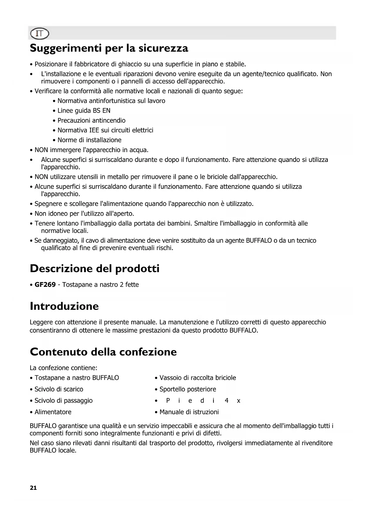 Scarica le istruzioni per il tuo Tostapane in formato PDF gratuitamente! Trova il tuo manuale GF269 - BUFFALO e riprendi in mano il tuo dispositivo elettronico. In questa pagina sono pubblicati tutti i documenti necessari per l'utilizzo del tuo dispositivo. GF269 del marchio BUFFALO.