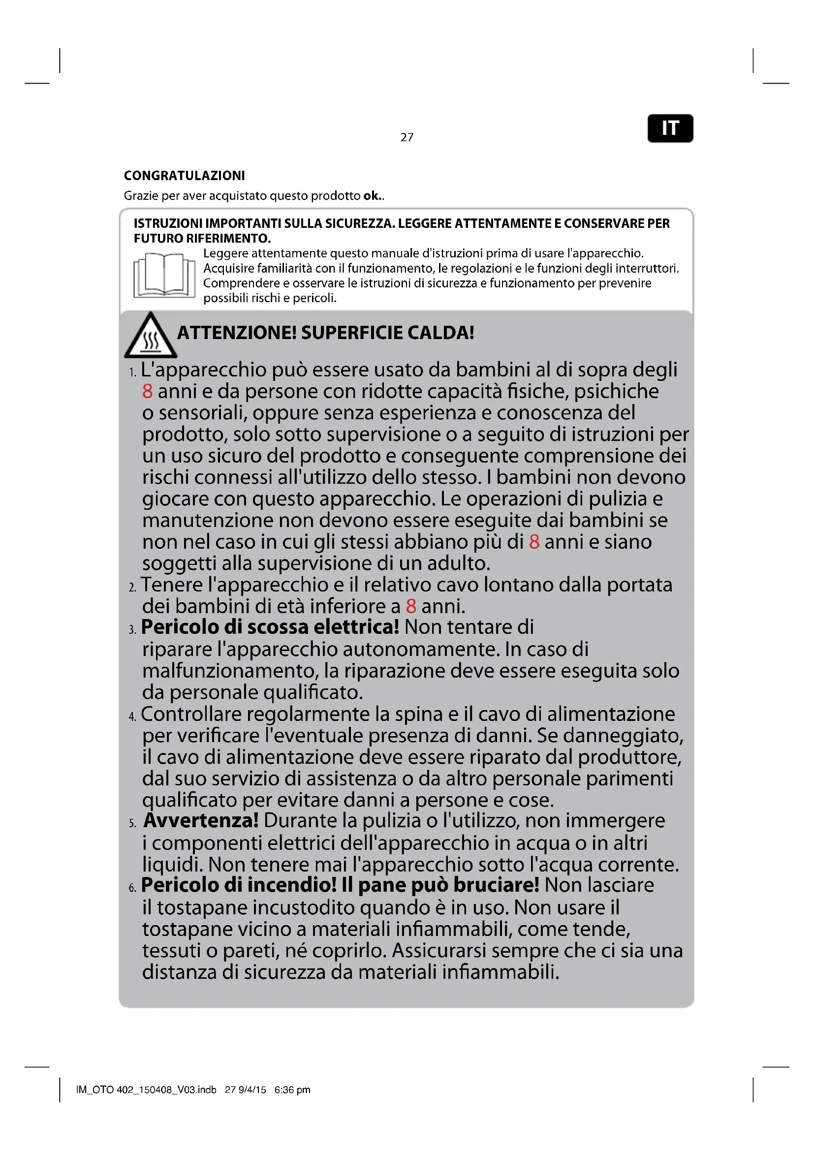 - Pericolo di incendio o scossa elettrica! Non inseire fette di pane troppo spesse. Non inseire fogli metallici o arnesi nel tostapane.