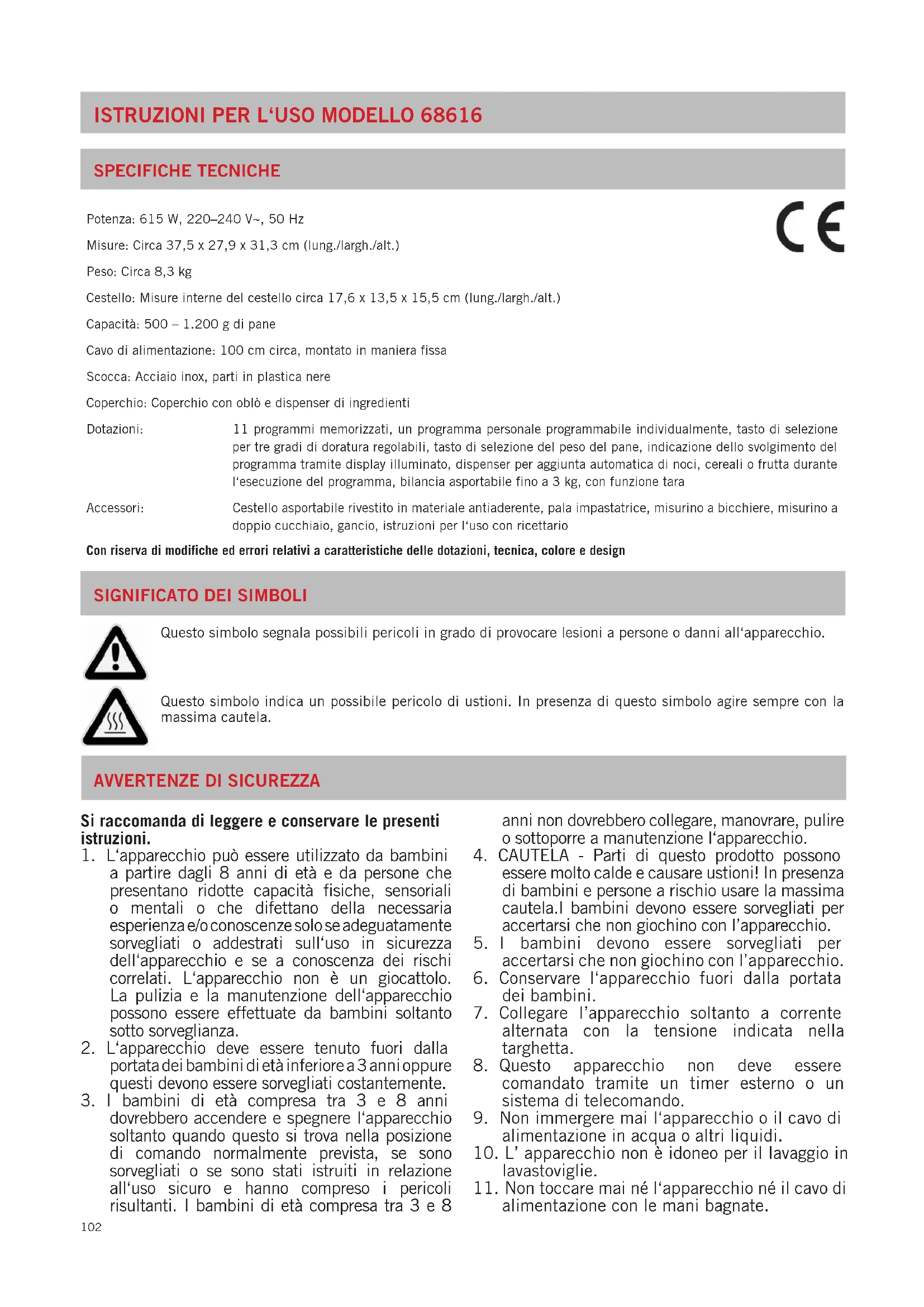 ingredienti superiori a quelle indicate, in particolare non per il pane bianco. Così facendo, infatti, il pane non cuoce in maniera uniforme oppure l‘impasto trabocca. Osservare le nostre avvertenze in merito.