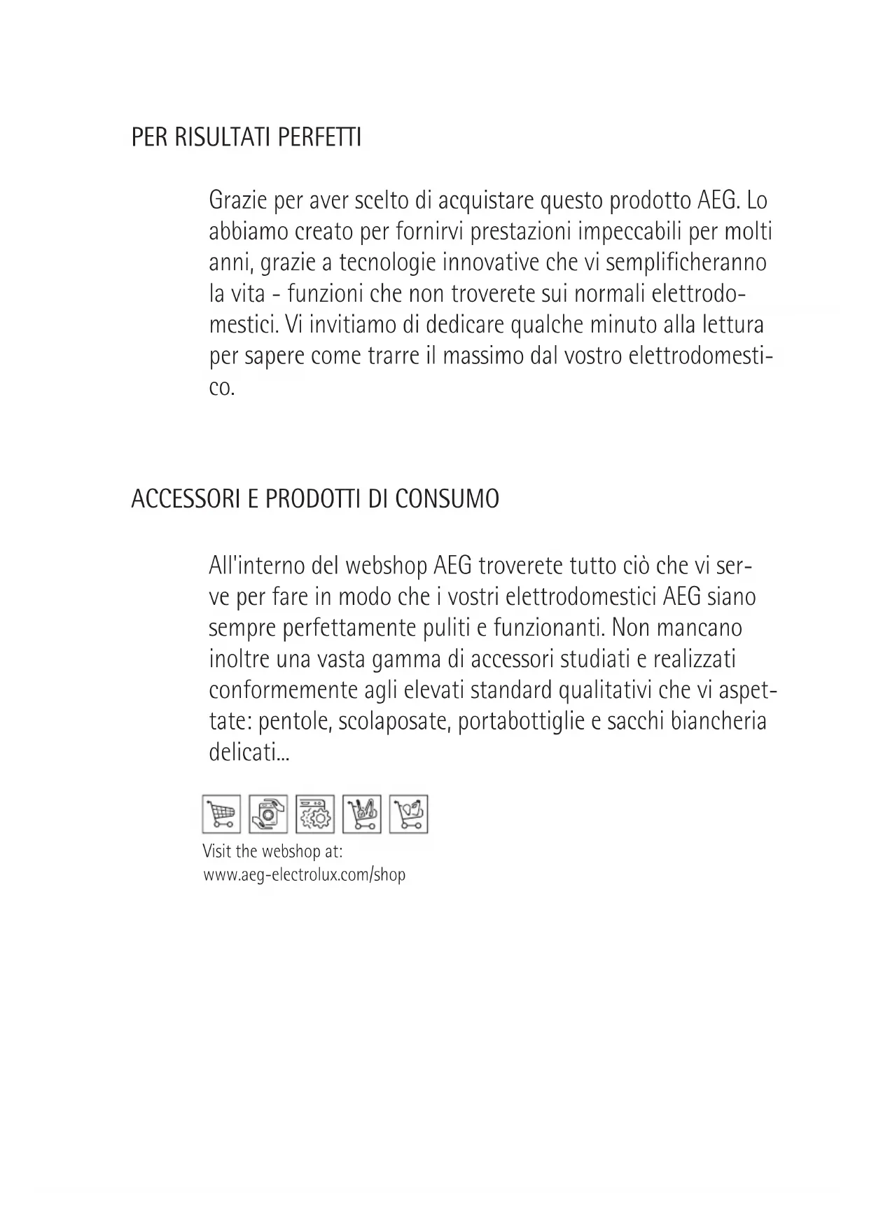 All'interno del webshop AEG troverete tutto ciò che vi ser- ve per fare in modo che i vostri elettrodomestici AEG siano sempre perfettamente puliti e funzionanti. Non mancano inoltre una vasta gamma di accessori studiati e realizzati conformemente agli elevati standard qualitativi che vi aspet- tate: pentole, scolaposate, portabottiglie e sacchi biancheria delicati... Visit the webshop at: www.aeg-electrolux.com/shopIT - CONSIGLI E SUGGERIMENTI
