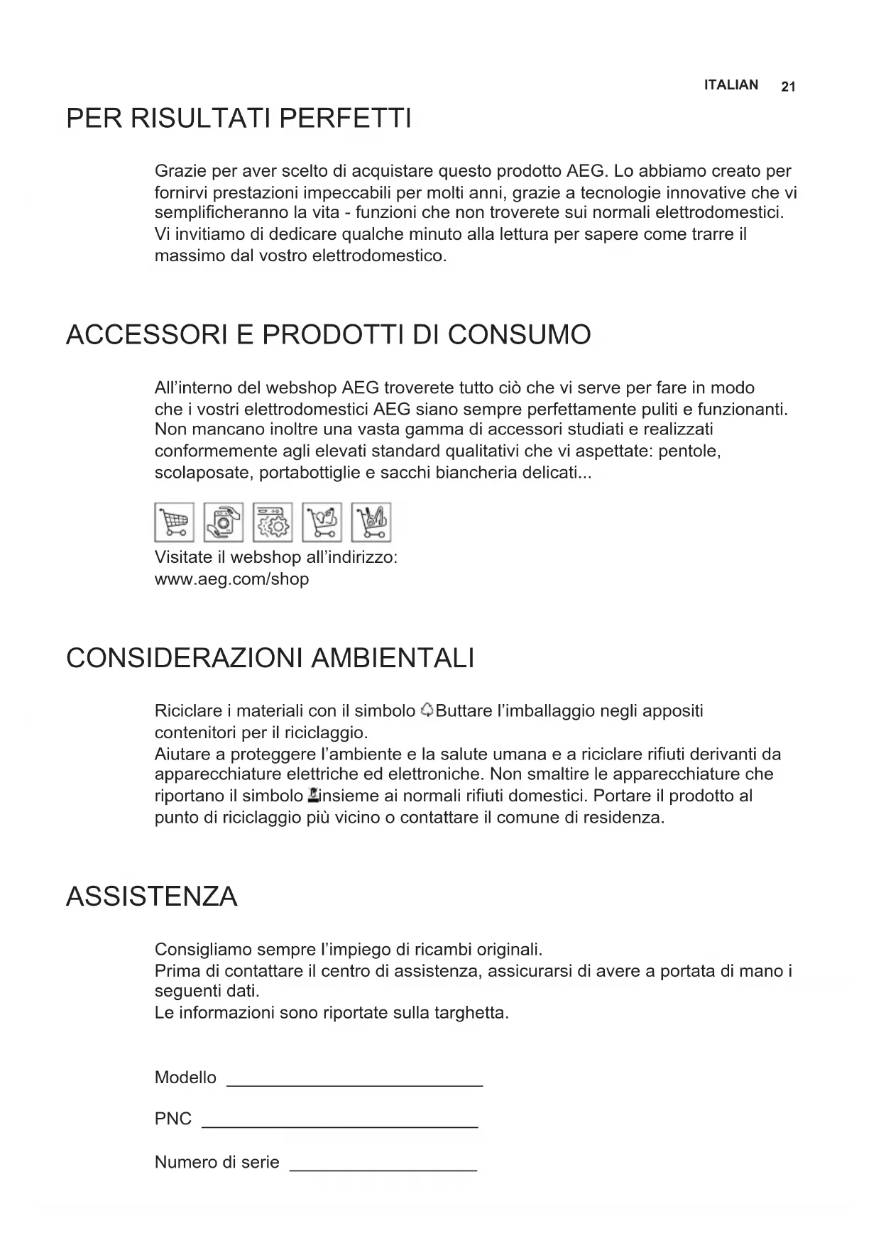 All’interno del webshop AEG troverete tutto ciò che vi serve per fare in modo che i vostri elettrodomestici AEG siano sempre perfettamente puliti e funzionanti. Non mancano inoltre una vasta gamma di accessori studiati e realizzati conformemente agli elevati standard qualitativi che vi aspettate: pentole, scolaposate, portabottiglie e sacchi biancheria delicati... Visitate il webshop all’indirizzo: www.aeg.com/shop CONSIDERAZIONI AMBIENTALI Riciclare i materiali con il simbolo . Buttare l’imballaggio negli appositi contenitori per il riciclaggio. Aiutare a proteggere l’ambiente e la salute umana e a riciclare riuti derivanti da apparecchiature elettriche ed elettroniche. Non smaltire le apparecchiature che riportano il simbolo insieme ai normali riuti domestici. Portare il prodotto al punto di riciclaggio più vicino o contattare il comune di residenza. ASSISTENZA Consigliamo sempre l’impiego di ricambi originali. Prima di contattare il centro di assistenza, assicurarsi di avere a portata di mano i seguenti dati. Le informazioni sono riportate sulla targhetta. Modello __________________________ PNC ____________________________ Numero di serie ___________________22