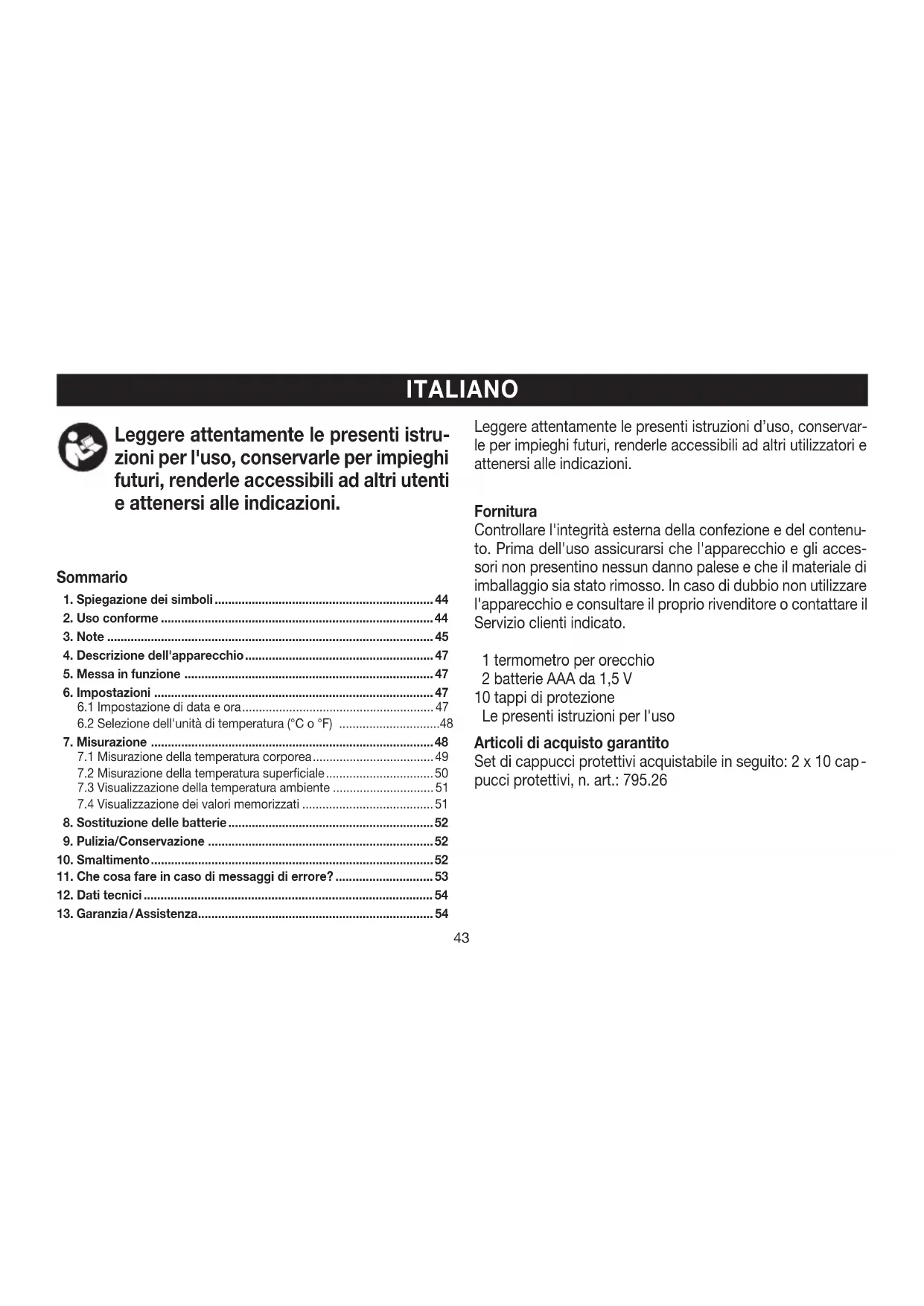 to. Prima dell'uso assicurarsi che l'apparecchio e gli acces- sori non presentino nessun danno palese e che il materiale di imballaggio sia stato rimosso. In caso di dubbio non utilizzare l'apparecchio e consultare il proprio rivenditore o contattare il Servizio clienti indicato. 1 termometro per orecchio 2 batterie AAA da 1,5 V 10 tappi di protezione Le presenti istruzioni per l'uso Articoli di acquisto garantito Set di cappucci protettivi acquistabile in seguito: 2 x 10 cap
