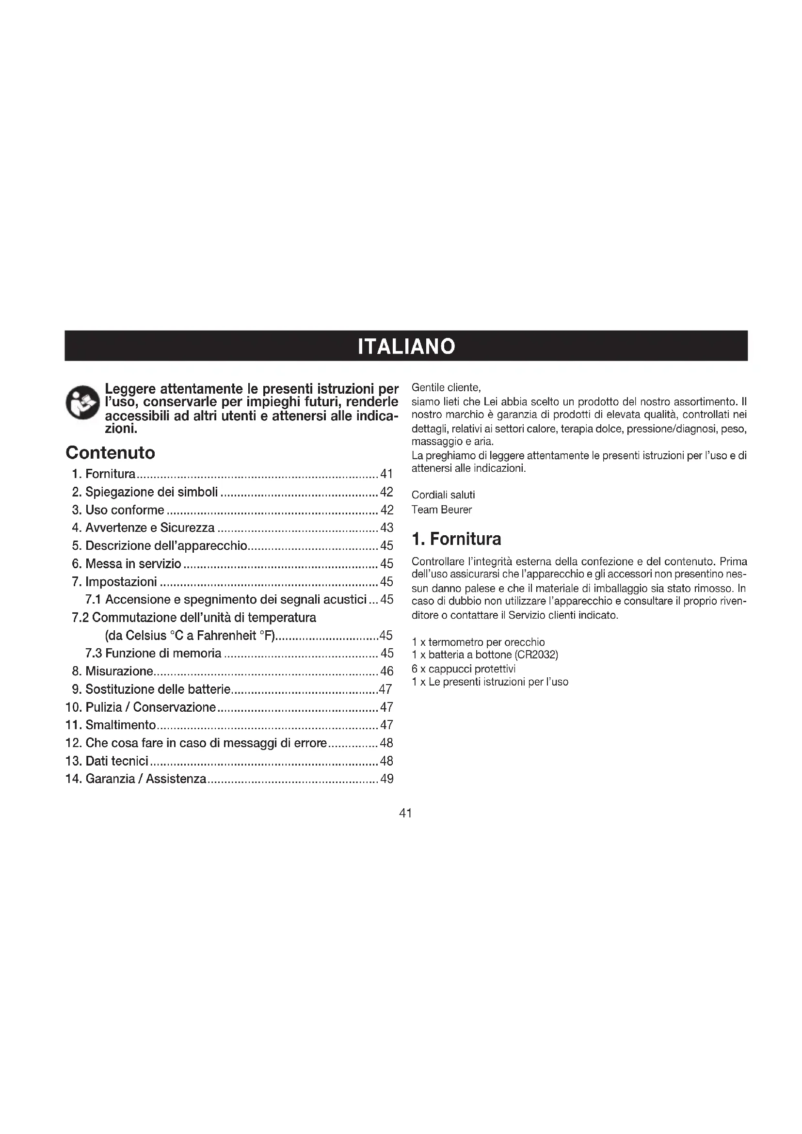Controllare l’integrità esterna della confezione e del contenuto. Prima dell’uso assicurarsi che l’apparecchio e gli accessori non presentino nes-sun danno palese e che il materiale di imballaggio sia stato rimosso. In caso di dubbio non utilizzare l’apparecchio e consultare il proprio riven-ditore o contattare il Servizio clienti indicato.1 x termometro per orecchio1 x batteria a bottone (CR2032)6 x cappucci protettivi1 x Le presenti istruzioni per l’uso Leggere attentamente le presenti istruzioni per l’uso, conservarle per impieghi futuri, renderle accessibili ad altri utenti e attenersi alle indica- zioni.42