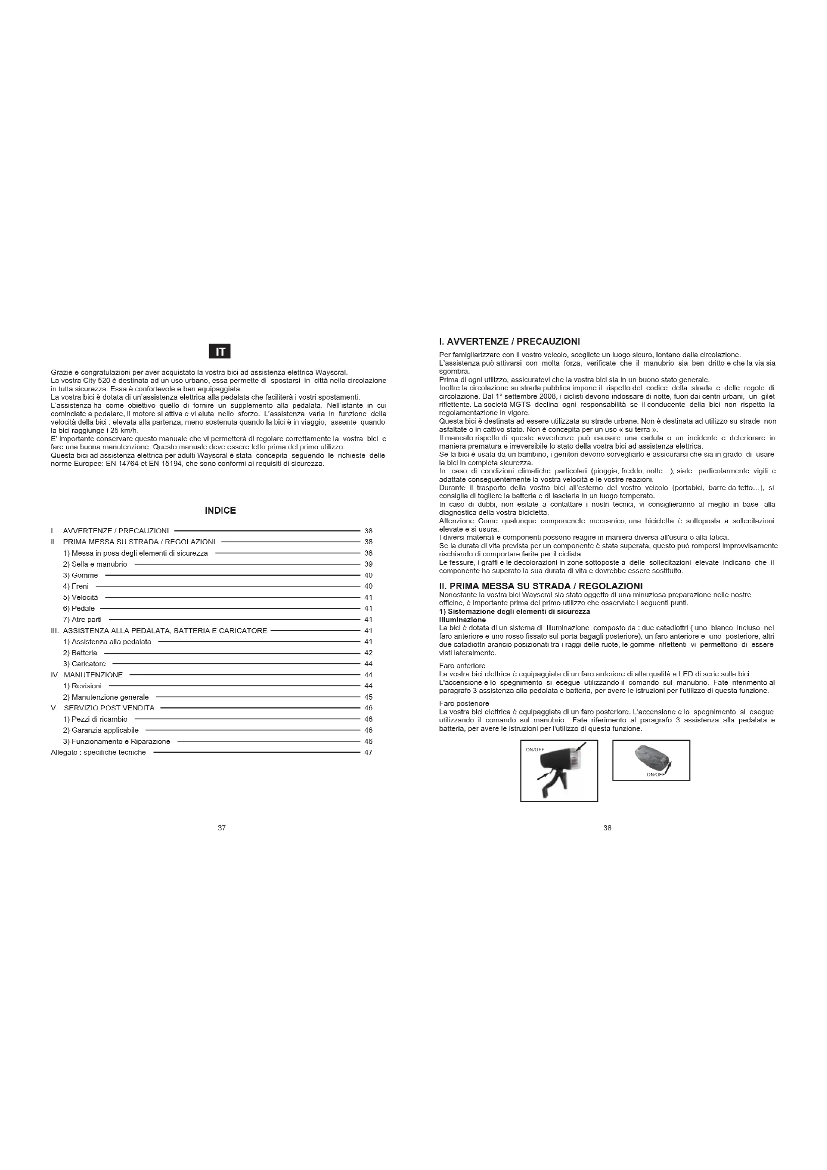 Allegato : specifiche tecniche Grazie e congratulazioni per aver acquistato la vostra bici ad assistenza elettrica Wayscral. La vostra City 520 è destinata ad un uso urbano, essa permette di spostarsi in città nella circolazione in tutta sicurezza. Essa è confortevole e ben equipaggiata. La vostra bici è dotata di un’assistenza elettrica alla pedalata che faciliterà i vostri spostamenti. L’assistenza ha come obiettivo quello di fornire un supplemento alla pedalata. Nell’istante in cui cominciate a pedalare, il motore si attiva e vi aiuta nello sforzo. L’assistenza varia in funzione della velocità della bici : elevata alla partenza, meno sostenuta quando la bici è in viaggio, assente quando la bici raggiunge i 25 km/h. E’ importante conservare questo manuale che vi permetterà di regolare correttamente la vostra bici e fare una buona manutenzione. Questo manuale deve essere letto prima del primo utilizzo. Questa bici ad assistenza elettrica per adulti Wayscral è stata concepita seguendo le richieste delle norme Europee: EN 14764 et EN 15194, che sono conformi ai requisiti di sicurezza.