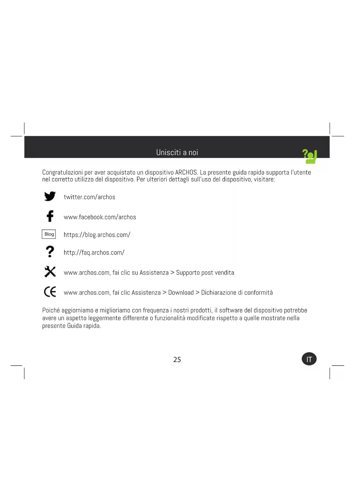 Unisciti a noi Congratulazioni per aver acquistato un dispositivo ARCHOS. La presente guida rapida supporta l'utente nel corretto utilizzo del dispositivo. Per ulteriori dettagli sull'uso del dispositivo, visitare: twitter.com/archos www.facebook.com/archos Blog https://blog.archos.com/ http://faq.archos.com/ www.archos.com, fai clic su Assistenza > Supporto post vendita www.archos.com, fai clic Assistenza > Download > Dichiarazione di conformità Poiché aggiorniamo e miglioriamo con frequenza i nostri prodotti, il software del dispositivo potrebbe avere un aspetto leggermente differente o funzionalità modificate rispetto a quelle mostrate nella presente Guida rapida.26 Warranty INPUT: 5V 1.5AModel: AC101AS3GV2MADE IN PRCARCHOS SA. 12 rue Ampère 91430 Igny France Access 101