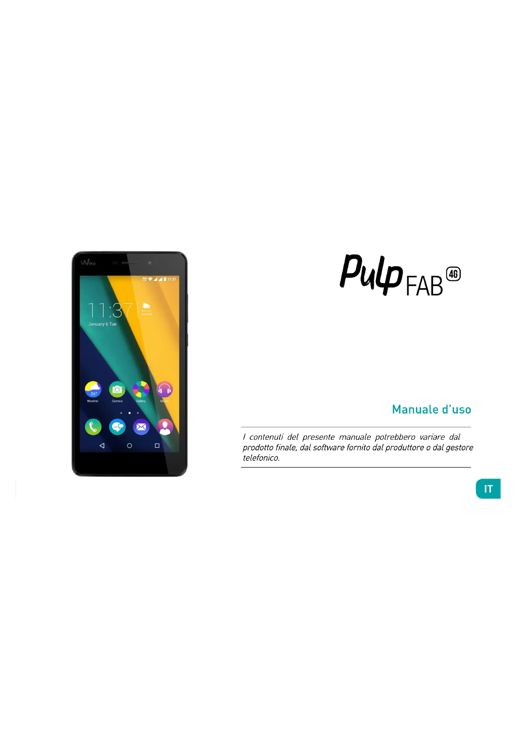 1, rue Capitaine Dessemond 13007 Marseille FRANCE www.wikomobile.com A pleine puissance, l’écoute prolongée du baladeur peut endommager l’oreille de l’utilisateur. Service Client WIKO: Téléphone :04.88.08.95.25 Mail : sav.particulier@wikomobile.comI contenuti del presente manuale potrebbero variare dal prodotto finale, dal software fornito dal produttore o dal gestore telefonico. Manuale d’usoCONGRATULAZIONI ! Hai appena acquistato un dispositivo WIKO PULP FAB 4G. Nella presente guida sono elencate le informazioni relative all’uso del tuo smartphone allo scopo di aiutarti a familiarizzare con l’universo WIKO. Copyright © 2015 WIKO Le informazioni contenute in questo manuale non possono essere né trasmesse né riprodotte in nessuna forma, senza l’autorizzazione scritta di WIKO. Marchi commerciali WIKO è un marchio depositato di WIKO SAS. Avvertenza Il presente manuale è stato realizzato con la massima attenzione e ha l’obiettivo di guidarvi nell’utilizzo di questo dispositivo. Tuttavia, le informazioni e i consigli d’uso che vi figurano non costituiscono una garanzia ai sensi del codice del consumo (D.Lgs.206/2005). WIKO si riserva il diritto di modificare in qualsiasi momento le informazioni contenute in questo manuale. Limitazione di responsabilità L’integralità dei servizi e dei contenuti accessibili da questo dispositivo sono di proprietà esclusiva di terzi e pertanto sono protetti da leggi (diritto d’autore, brevetto, licenza, e altre leggi sulla proprietà intellettuale). Tali servizi sono riservati al vostro uso personale e non per un uso commerciale. Non è possibile utilizzare tali contenuti o servizi senza previa richiesta scritta al proprietario del contenuto. Non è possibile in alcun modo copiare, pubblicare, trasferire, vendere o sfruttare con qualsiasi supporto contenutio servizi modificati tramite questo dispositivo o di crearne forme derivate. I SERVIZI E I CONTENUTI DI TERZI SONO FORNITI “COME TALI”. WIKO NON GARANTISCE I CONTENUTI O I SERVIZI IN TAL MODO FORNITI, ESPRESSAMENTE