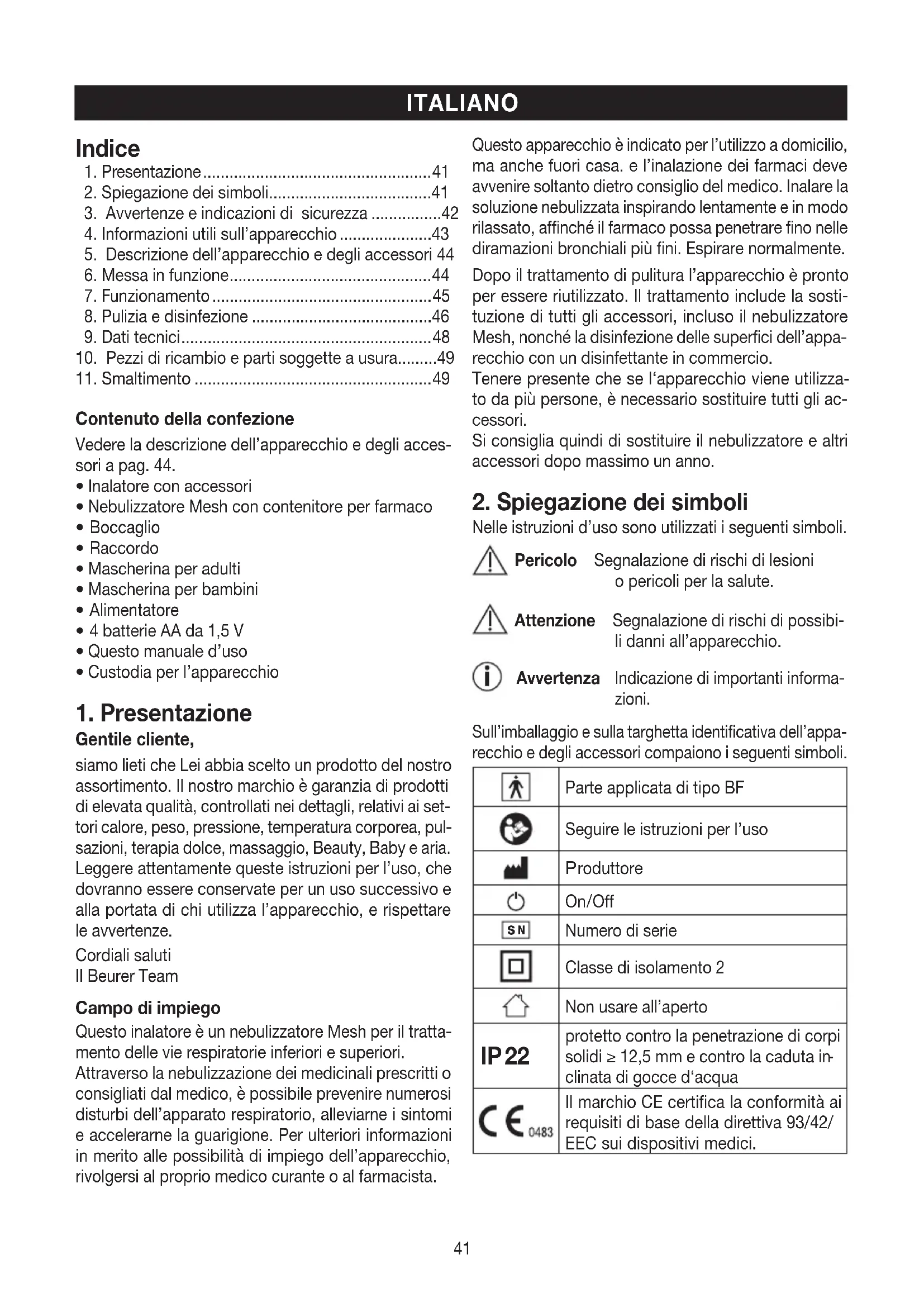 Gentile cliente, siamo lieti che Lei abbia scelto un prodotto del nostro assortimento. Il nostro marchio è garanzia di prodotti di elevata qualità, controllati nei dettagli, relativi ai set- tori calore, peso, pressione, temperatura corporea, pul- sazioni, terapia dolce, massaggio, Beauty, Baby e aria. Leggere attentamente queste istruzioni per l’uso, che dovranno essere conservate per un uso successivo e alla portata di chi utilizza l’apparecchio, e rispettare le avvertenze. Cordiali saluti Il Beurer Team Campo di impiego Questo inalatore è un nebulizzatore Mesh per il tratta- mento delle vie respiratorie inferiori e superiori. Attraverso la nebulizzazione dei medicinali prescritti o consigliati dal medico, è possibile prevenire numerosi disturbi dell’apparato respiratorio, alleviarne i sintomi e accelerarne la guarigione. Per ulteriori informazioni in merito alle possibilità di impiego dell’apparecchio, rivolgersi al proprio medico curante o al farmacista. Questo apparecchio è indicato per l’utilizzo a domicilio, ma anche fuori casa. e l’inalazione dei farmaci deve avvenire soltanto dietro consiglio del medico. Inalare la soluzione nebulizzata inspirando lentamente e in modo rilassato, affinché il farmaco possa penetrare fino nelle diramazioni bronchiali più fini. Espirare normalmente. Dopo il trattamento di pulitura l’apparecchio è pronto per essere riutilizzato. Il trattamento include la sosti- tuzione di tutti gli accessori, incluso il nebulizzatore Mesh, nonché la disinfezione delle superfici dell’appa- recchio con un disinfettante in commercio. Tenere presente che se l‘apparecchio viene utilizza- to da più persone, è necessario sostituire tutti gli ac- cessori. Si consiglia quindi di sostituire il nebulizzatore e altri accessori dopo massimo un anno.