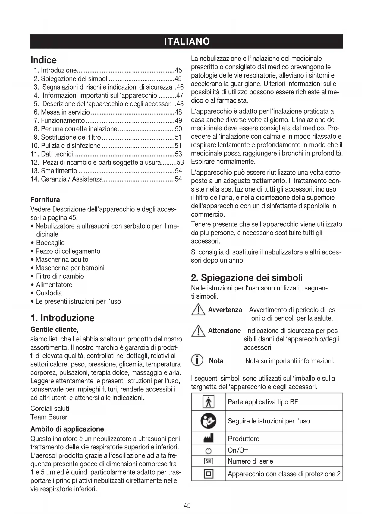 ti di elevata qualità, controllati nei dettagli, relativi ai settori calore, peso, pressione, glicemia, temperatura corporea, pulsazioni, terapia dolce, massaggio e aria. Leggere attentamente le presenti istruzioni per l‘uso, conservarle per impieghi futuri, renderle accessibili ad altri utenti e attenersi alle indicazioni. Cordiali saluti Team Beurer Ambito di applicazione Questo inalatore è un nebulizzatore a ultrasuoni per il trattamento delle vie respiratorie superiori e inferiori. L‘aerosol prodotto grazie all‘oscillazione ad alta fre