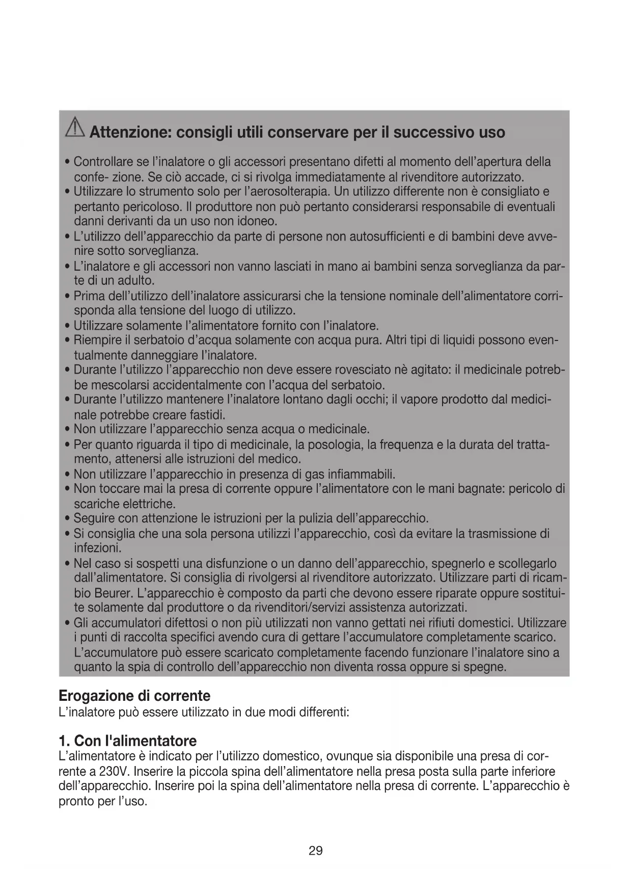 - Gli accumulatori difettosi o non più utilizzati non vanno gettati nei rifiuti domestici. Utilizzare i punti di raccolta specifici avendo cura di gettare l’accumulatore completamente scarico. L’accumulatore può essere scaricato completamente facendo funzionare l’inalatore sino a quanto la spia di controllo dell’apparecchio non diventa rossa oppure si spegne. Erogazione di corrente L’inalatore può essere utilizzato in due modi dierenti: