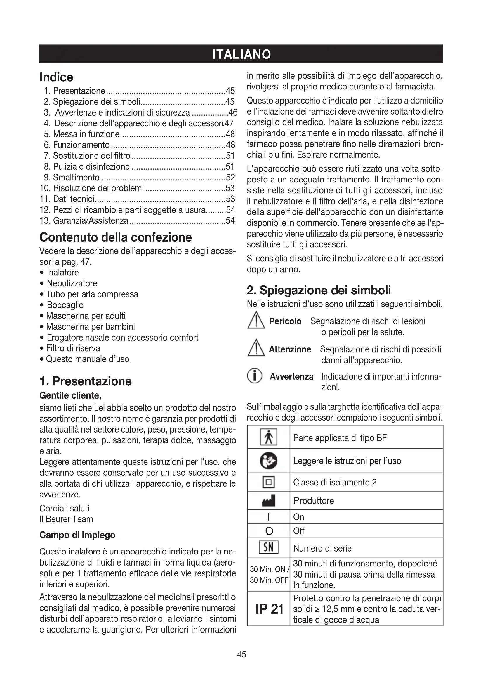 Gentile cliente, siamo lieti che Lei abbia scelto un prodotto del nostro assortimento. Il nostro nome è garanzia per prodotti di alta qualità nel settore calore, peso, pressione, tempe- ratura corporea, pulsazioni, terapia dolce, massaggio e aria. Leggere attentamente queste istruzioni per l’uso, che dovranno essere conservate per un uso successivo e alla portata di chi utilizza l’apparecchio, e rispettare le avvertenze. Cordiali saluti Il Beurer Team Campo di impiego Questo inalatore è un apparecchio indicato per la ne- bulizzazione di fluidi e farmaci in forma liquida (aero- sol) e per il trattamento efficace delle vie respiratorie inferiori e superiori. Attraverso la nebulizzazione dei medicinali prescritti o consigliati dal medico, è possibile prevenire numerosi disturbi dell’apparato respiratorio, alleviarne i sintomi e accelerarne la guarigione. Per ulteriori informazioni in merito alle possibilità di impiego dell’apparecchio, rivolgersi al proprio medico curante o al farmacista. Questo apparecchio è indicato per l’utilizzo a domicilio e l’inalazione dei farmaci deve avvenire soltanto dietro consiglio del medico. Inalare la soluzione nebulizzata inspirando lentamente e in modo rilassato, affinché il farmaco possa penetrare fino nelle diramazioni bron