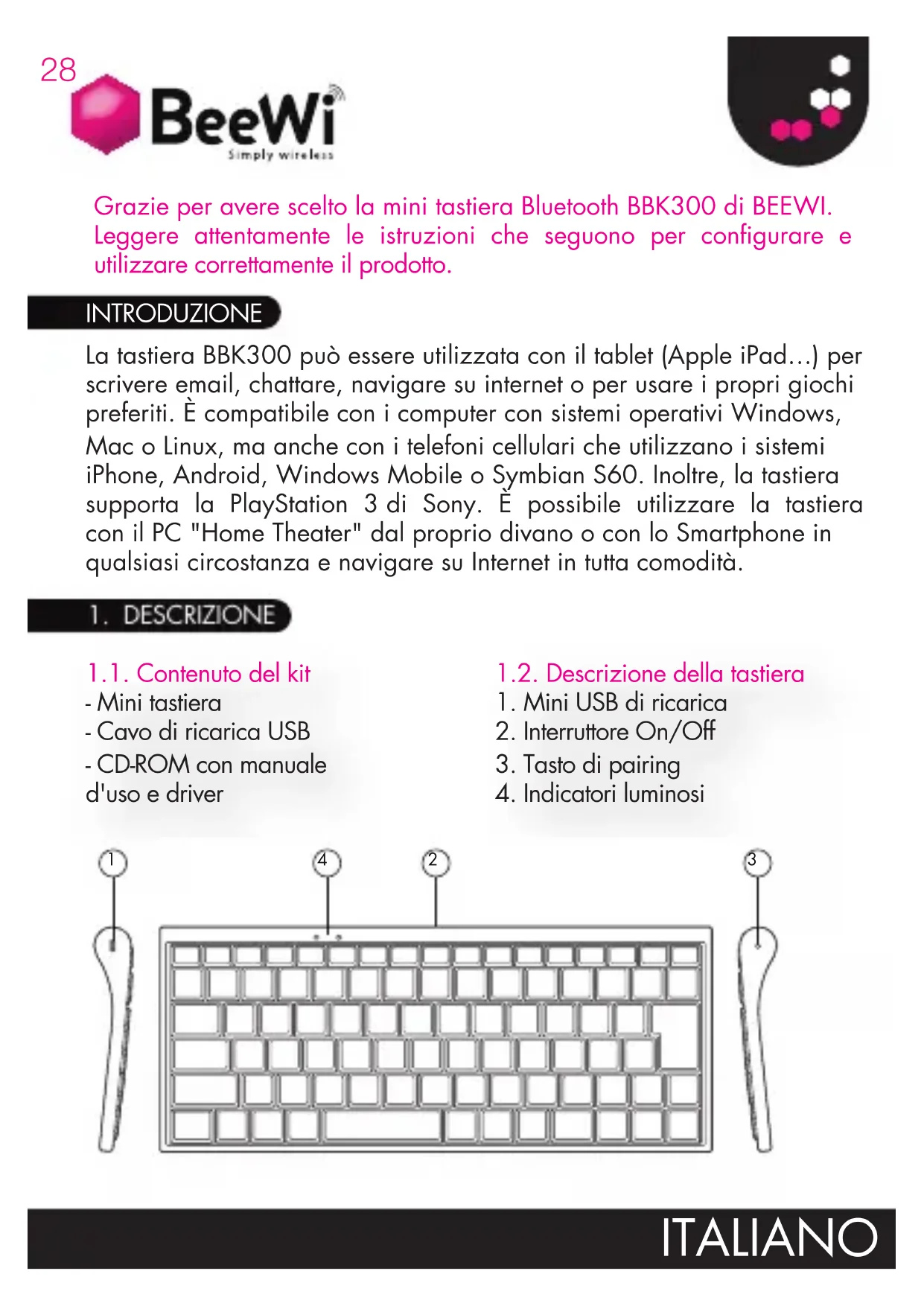 - Tutte le altre Direttive UE rilevanti La nostra dichiarazione di conformità (DoC: Declaration of Conformity) alla Direttiva 1999/5/EC (Direttiva R&TTE) può essere visualizzata sul sito www.bee-wi.com. Salvaguardia dell’ambiente con il riciclaggio Non smaltire i dispositivi o gli accessori elettrici con i rifi uti domestici. Alcuni paesi o regioni prevedono sistemi di raccolta differenziata per lo smaltimento di materiali elettrici ed elettronici. Per ulteriori informazioni, contattare le autorità locali. Copyright ed altre informazioni di legali BEEWI è una marca registrata. I marchi Apple, “Made for iPod”, “Works with iPhone” e Bluetooth sono marchi di proprietà ed vengono utilizzati dalla BEEWI sotto licenza. Tutti gli altri prodotti o nomi di servizi appartengono ai rispettivi proprietari. L’uso di dispositivi wireless ed i loro accessori possono essere proibiti o limitati in determinate zone, si raccomanda pertanto di seguire sempre le leggi ed i regolamenti sull’uso di questi prodotti. Questo prodotto è coperto da una garanzia di 2 anni, valida a decorrere dalla data dell’acquisto. Gli utenti non posso apportare in nessun modo cambiamenti o modifiche al dispositivo. Cambiamenti o modifiche non espressamente approvati dalla parte responsabile della conformità del dispositivo invalideranno la garanzia dell’utente. Per ulteriori informazioni visitare il nostro sito internet www.bee-wi.com. Supporto tecnico: support@bee-wi.com. © VOXLAND, 201036 ESPAÑOL Puedes utilizar el teclado BBK300 conjuntamente con tu tableta gráfica (Apple iPad…) para escribir e-mails, chatear, navegar por Internet o incluso disfrutar con tus juegos favoritos. Es compatible con los ordenadores que funcionan con Windows, Mac o Linux, pero también con los teléfonos móviles que utilizan los sistemas iPhone, Android, Windows Mobile o Symbian S60. El teclado soporta también la PlayStation 3 de Sony. Utilice el teclado con su PC «Home Theater» desde el sofá de su casa o con su Smartphone en cualquier circunstancia y navegue por Internet de la forma más cómoda. 1.1. Contenido de la caja - Mini teclado. - Cable de recarga USB. - CDROM con manual de utilización y pilotos. 1.2. Inspección del teclado
