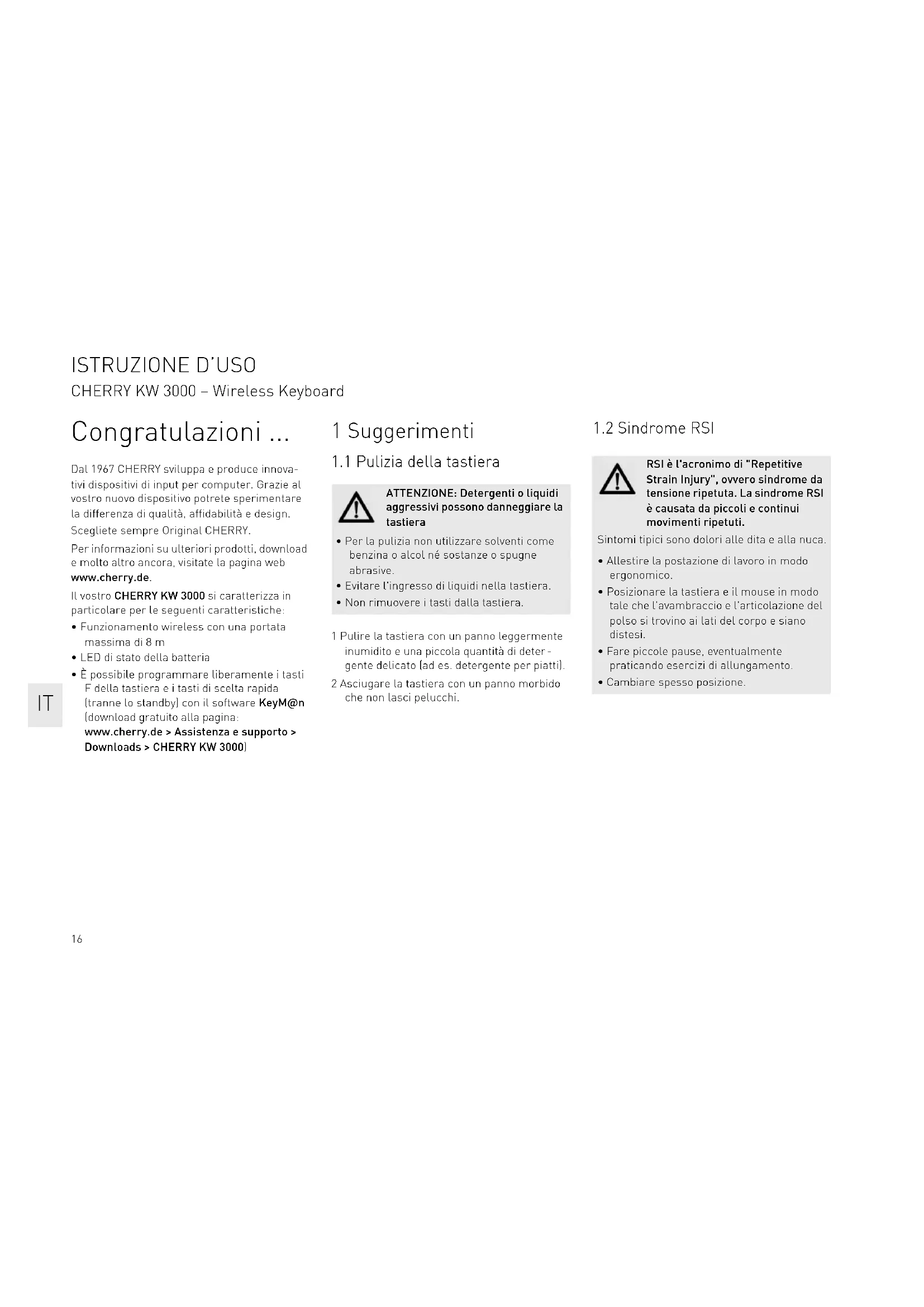 - È possibile programmare liberamente i tasti F della tastiera e i tasti di scelta rapida (tranne lo standby) con il software KeyM@n (download gratuito alla pagina: www.cherry.de > Assistenza e supporto > Downloads > CHERRY KW 3000) 1 Suggerimenti