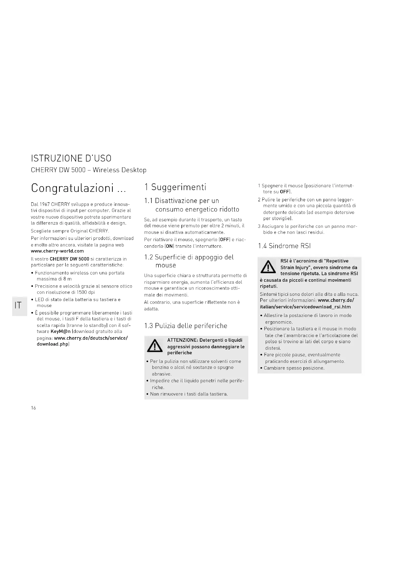 RSI è l'acronimo di "Repetitive Strain Injury", ovvero sindrome da tensione ripetuta. La sindrome RSI è causata da piccoli e continui movimenti ripetuti. Sintomi tipici sono dolori alle dita e alla nuca. Per ulteriori informazioni: www.cherry.de/ italian/service/servicedownload_rsi.htm