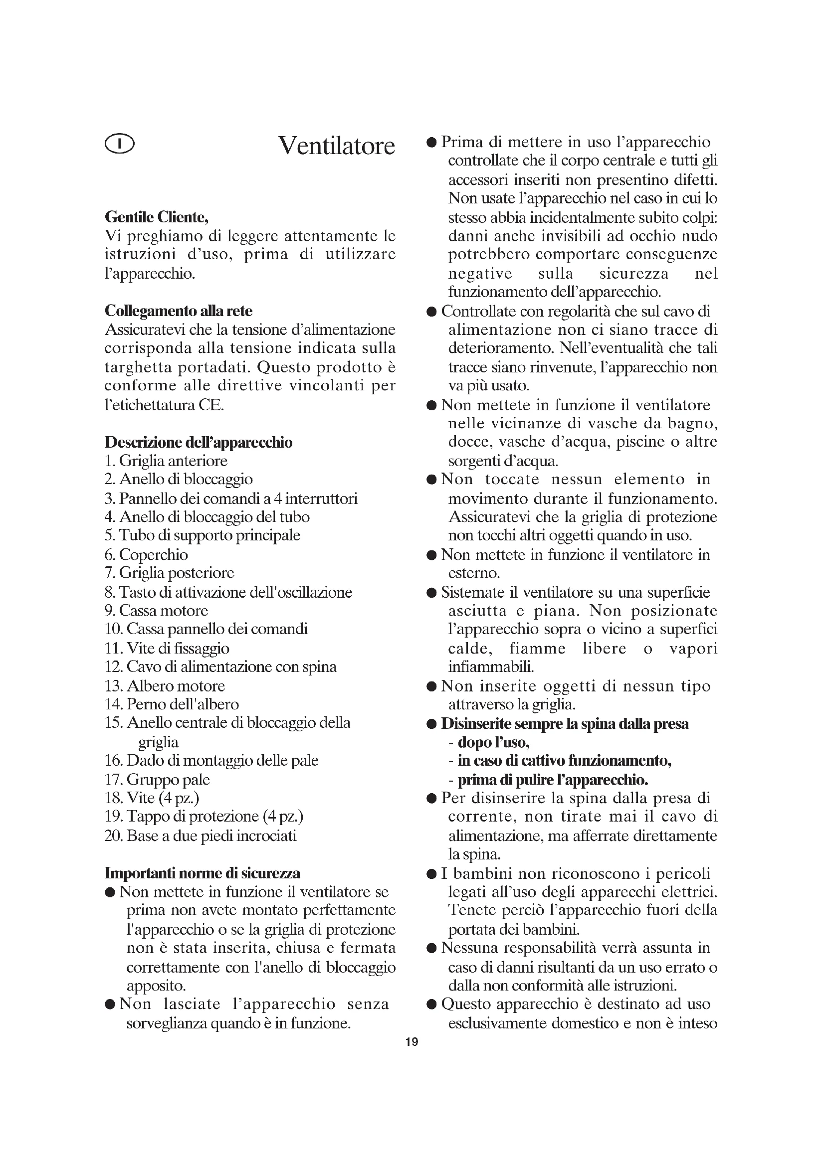 Importanti norme di sicurezza ● Non mettete in funzione il ventilatore se prima non avete montato perfettamente l'apparecchio o se la griglia di protezione non è stata inserita, chiusa e fermata correttamente con l'anello di bloccaggio apposito. ● Non lasciate l’apparecchio senza sorveglianza quando è in funzione. ● Prima di mettere in uso l’apparecchio controllate che il corpo centrale e tutti gli accessori inseriti non presentino difetti. Non usate l’apparecchio nel caso in cui lo stesso abbia incidentalmente subito colpi: danni anche invisibili ad occhio nudo potrebbero comportare conseguenze negative sulla sicurezza nel funzionamento dell’apparecchio. ● Controllate con regolarità che sul cavo di alimentazione non ci siano tracce di deterioramento. Nell’eventualità che tali tracce siano rinvenute, l’apparecchio non va più usato. ● Non mettete in funzione il ventilatore nelle vicinanze di vasche da bagno, docce, vasche d’acqua, piscine o altre sorgenti d’acqua. ● Non toccate nessun elemento in movimento durante il funzionamento. Assicuratevi che la griglia di protezione non tocchi altri oggetti quando in uso. ● Non mettete in funzione il ventilatore in esterno. ● Sistemate il ventilatore su una superficie asciutta e piana. Non posizionate l’apparecchio sopra o vicino a superfici calde, fiamme libere o vapori infiammabili. ● Non inserite oggetti di nessun tipo attraverso la griglia. ● Disinserite sempre la spina dalla presa - dopo l’uso, - in caso di cattivo funzionamento, - prima di pulire l’apparecchio. ● Per disinserire la spina dalla presa di corrente, non tirate mai il cavo di alimentazione, ma afferrate direttamente la spina. ● I bambini non riconoscono i pericoli legati all’uso degli apparecchi elettrici. Tenete perciò l’apparecchio fuori della portata dei bambini. ● Nessuna responsabilità verrà assunta in caso di danni risultanti da un uso errato o dalla non conformità alle istruzioni. ● Questo apparecchio è destinato ad uso esclusivamente domestico e non è inteso
