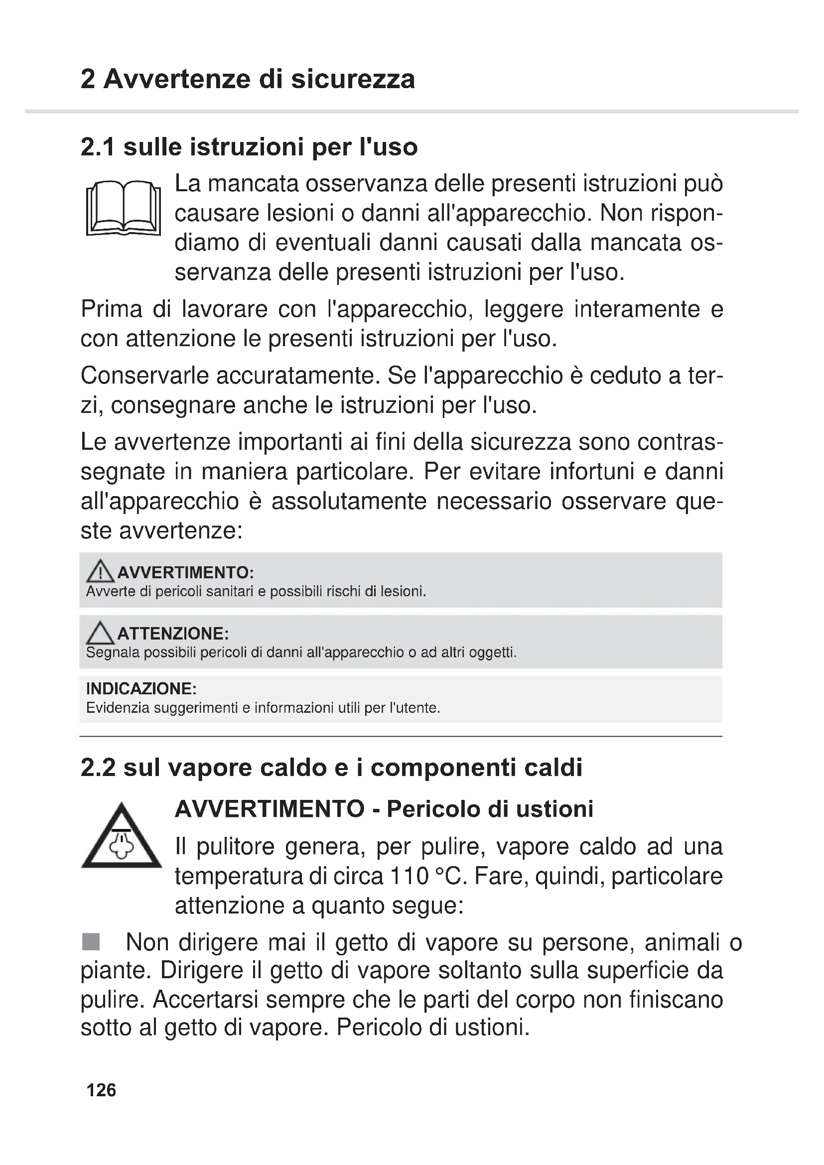 AVVERTIMENTO - Pericolo di ustioni Il pulitore genera, per pulire, vapore caldo ad una temperatura di circa 110 °C. Fare, quindi, particolare attenzione a quanto segue: Non dirigere mai il getto di vapore su persone, animali o piante. Dirigere il getto di vapore soltanto sulla superficie da pulire. Accertarsi sempre che le parti del corpo non finiscano sotto al getto di vapore. Pericolo di ustioni. AVVERTIMENTO: Avverte di pericoli sanitari e possibili rischi di lesioni. ATTENZIONE: Segnala possibili pericoli di danni all'apparecchio o ad altri oggetti. INDICAZIONE: Evidenzia suggerimenti e informazioni utili per l'utente.