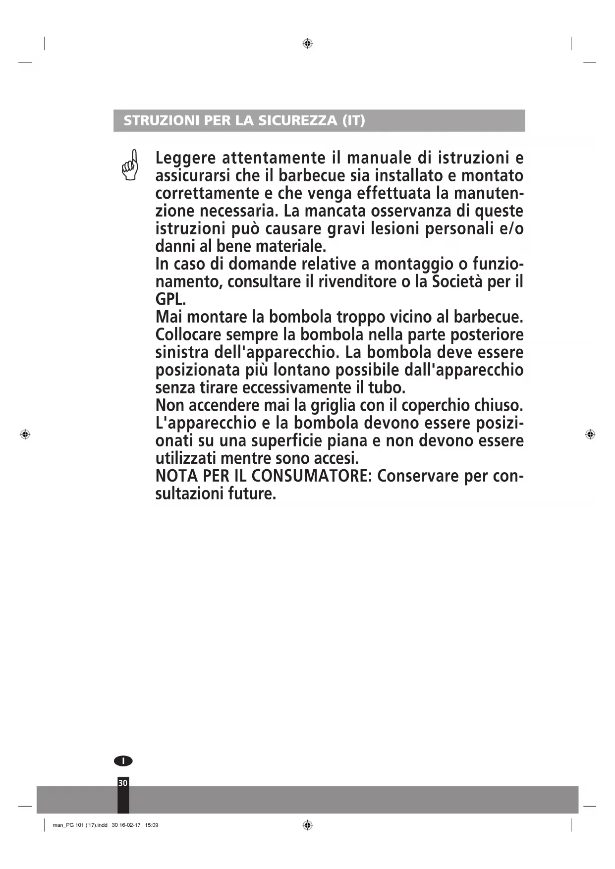 man_PG 101 ('17).indd 32 16-02-17 15:0933 PRIMA DELL'USO CONTROLLARE LA PRESENZA DI EVENTUALI PERDITE Non controllare la presenza di perdite con la fiamma, utiliz- zare sempre una soluzione di acqua saponata un detergente delicato per la pulizia. Riporre l'apparecchio in un ambiente pulito e asciutto. Non conservare la bombola del gas all'interno. Conservarla in luogo ben ventilato al riparo dalla luce solare diretta.