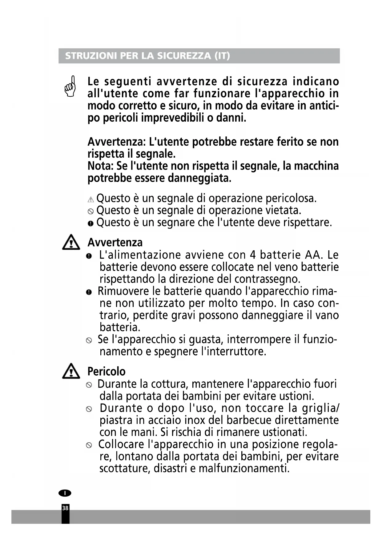 Le seguenti avvertenze di sicurezza indicano all'utente come far funzionare l'apparecchio in modo corretto e sicuro, in modo da evitare in antici- po pericoli imprevedibili o danni. Avvertenza: L'utente potrebbe restare ferito se non rispetta il segnale. Nota: Se l'utente non rispetta il segnale, la macchina potrebbe essere danneggiata. Questo è un segnale di operazione pericolosa. Questo è un segnale di operazione vietata. Questo è un segnare che l'utente deve rispettare. Avvertenza L'alimentazione avviene con 4 batterie AA. Le batterie devono essere collocate nel veno batterie rispettando la direzione del contrassegno. Rimuovere le batterie quando l'apparecchio rima- ne non utilizzato per molto tempo. In caso con- trario, perdite gravi possono danneggiare il vano batteria. Se l'apparecchio si guasta, interrompere il funzio- namento e spegnere l'interruttore. Pericolo Durante la cottura, mantenere l'apparecchio fuori dalla portata dei bambini per evitare ustioni. Durante o dopo l'uso, non toccare la griglia/ piastra in acciaio inox del barbecue direttamente con le mani. Si rischia di rimanere ustionati. Collocare l'apparecchio in una posizione regola- re, lontano dalla portata dei bambini, per evitare scottature, disastri e malfunzionamenti. >39 Dopo l'uso