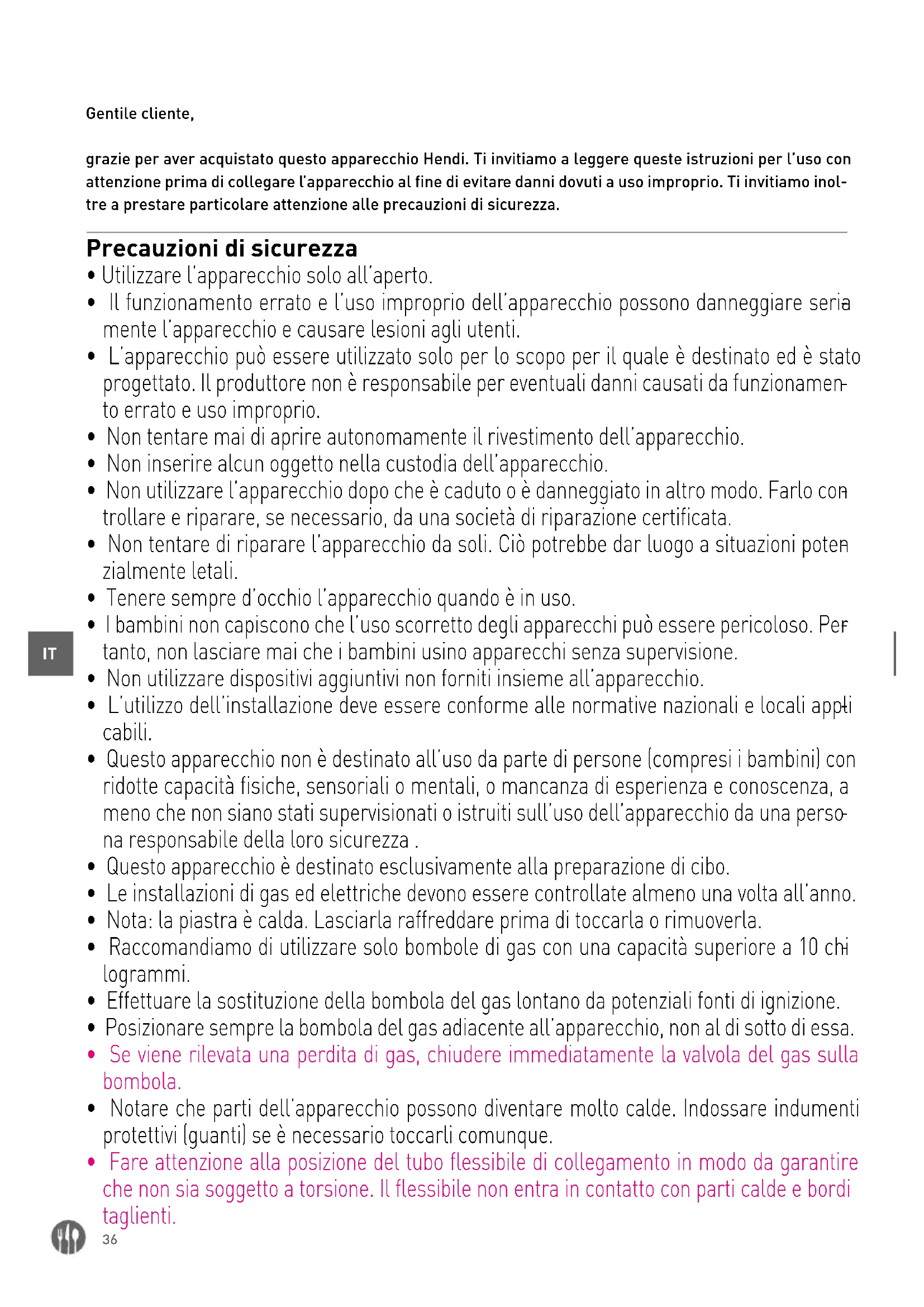 - Chiudere sempre la valvola del gas sulla bombola del gas se l’apparecchio non viene più utilizzato.