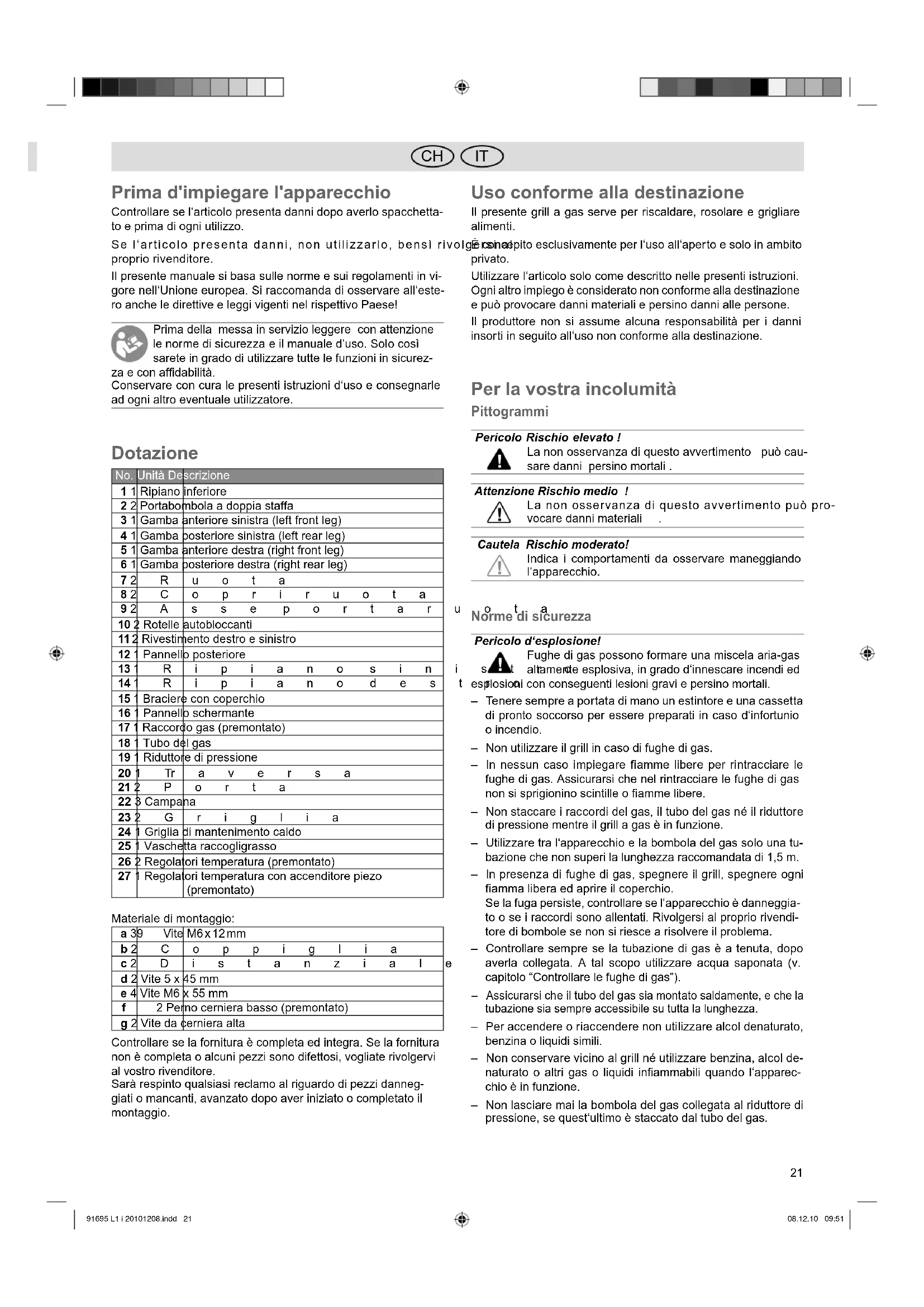 ITCH Prima d'impiegare l'apparecchio Controllare se l‘articolo presenta danni dopo averlo spacchetta- to e prima di ogni utilizzo. Se l‘articolo presenta danni, non utilizzarlo, bensì rivolgersi al proprio rivenditore. Il presente manuale si basa sulle norme e sui regolamenti in vi- gore nell‘Unione europea. Si raccomanda di osservare all‘este- ro anche le direttive e leggi vigenti nel rispettivo Paese! Prima della messa in servizio leggere con attenzione le norme di sicurezza e il manuale d‘uso. Solo così sarete in grado di utilizzare tutte le funzioni in sicurez- za e con affidabilità. Conservare con cura le presenti istruzioni d‘uso e consegnarle ad ogni altro eventuale utilizzatore. Dotazione No. Unità Descrizione 1 1 Ripiano inferiore 2 2 Portabombola a doppia staffa 3 1 Gamba anteriore sinistra (left front leg) 4 1 Gamba posteriore sinistra (left rear leg) 5 1 Gamba anteriore destra (right front leg) 6 1 Gamba posteriore destra (right rear leg) 7 2Ruota 8 2Copriruota 9 2Asse portaruota 10 2 Rotelle autobloccanti 11 2 Rivestimento destro e sinistro 12 1 Pannello posteriore 13 1Ripiano sinistro 14 1Ripiano destro 15 1 Braciere con coperchio 16 1 Pannello schermante 17 1 Raccordo gas (premontato) 18 1 Tubo del gas 19 1 Riduttore di pressione 20 1Traversa 21 2Porta 22 3 Campana 23 2Griglia 24 1 Griglia di mantenimento caldo 25 1 Vaschetta raccogligrasso 26 2 Regolatori temperatura (premontato) 27 1 Regolatori temperatura con accenditore piezo (premontato) Materiale di montaggio: a 39 Vite M6 x 12 mm b 2Coppiglia c 2Distanziale d 2 Vite 5 x 45 mm e 4 Vite M6 x 55 mm f 2 Perno cerniera basso (premontato) g 2 Vite da cerniera alta Controllare se la fornitura è completa ed integra. Se la fornitura non è completa o alcuni pezzi sono difettosi, vogliate rivolgervi al vostro rivenditore. Sarà respinto qualsiasi reclamo al riguardo di pezzi danneg- giati o mancanti, avanzato dopo aver iniziato o completato il montaggio. Uso conforme alla destinazione Il presente grill a gas serve per riscaldare, rosolare e grigliare alimenti. È concepito esclusivamente per l‘uso all‘aperto e solo in ambito privato. Utilizzare l‘articolo solo come descritto nelle presenti istruzioni. Ogni altro impiego è considerato non conforme alla destinazione e può provocare danni materiali e persino danni alle persone. Il produttore non si assume alcuna responsabilità per i danni insorti in seguito all‘uso non conforme alla destinazione. Per la vostra incolumità Pittogrammi Pericolo Rischio elevato ! La non osservanza di questo avvertimento può cau- sare danni persino mortali . Attenzione Rischio medio ! La non osservanza di questo avvertimento può pro- vocare danni materiali . Cautela Rischio moderato! Indica i comportamenti da osservare maneggiando l‘apparecchio. Norme di sicurezza Pericolo d‘esplosione! Fughe di gas possono formare una miscela aria-gas altamente esplosiva, in grado d‘innescare incendi ed esplosioni con conseguenti lesioni gravi e persino mortali. – Tenere sempre a portata di mano un estintore e una cassetta di pronto soccorso per essere preparati in caso d‘infortunio o incendio. – Non utilizzare il grill in caso di fughe di gas. – In nessun caso impiegare fiamme libere per rintracciare le fughe di gas. Assicurarsi che nel rintracciare le fughe di gas non si sprigionino scintille o fiamme libere. – Non staccare i raccordi del gas, il tubo del gas né il riduttore di pressione mentre il grill a gas è in funzione. – Utilizzare tra l‘apparecchio e la bombola del gas solo una tu- bazione che non superi la lunghezza raccomandata di 1,5 m. – In presenza di fughe di gas, spegnere il grill, spegnere ogni fiamma libera ed aprire il coperchio. Se la fuga persiste, controllare se l‘apparecchio è danneggia- to o se i raccordi sono allentati. Rivolgersi al proprio rivendi- tore di bombole se non si riesce a risolvere il problema. – Controllare sempre se la tubazione di gas è a tenuta, dopo averla collegata. A tal scopo utilizzare acqua saponata (v. capitolo “Controllare le fughe di gas”). – Assicurarsi che il tubo del gas sia montato saldamente, e che la tubazione sia sempre accessibile su tutta la lunghezza. – Per accendere o riaccendere non utilizzare alcol denaturato, benzina o liquidi simili. – Non conservare vicino al grill né utilizzare benzina, alcol de- naturato o altri gas o liquidi infiammabili quando l‘apparec- chio è in funzione. – Non lasciare mai la bombola del gas collegata al riduttore di pressione, se quest‘ultimo è staccato dal tubo del gas. 91695 L1 i 20101208.indd 21 91695 L1 i 20101208.indd 21
