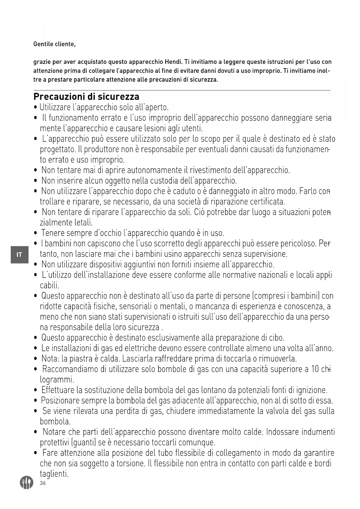 - Chiudere sempre la valvola del gas sulla bombola del gas se l’apparecchio non viene più utilizzato.