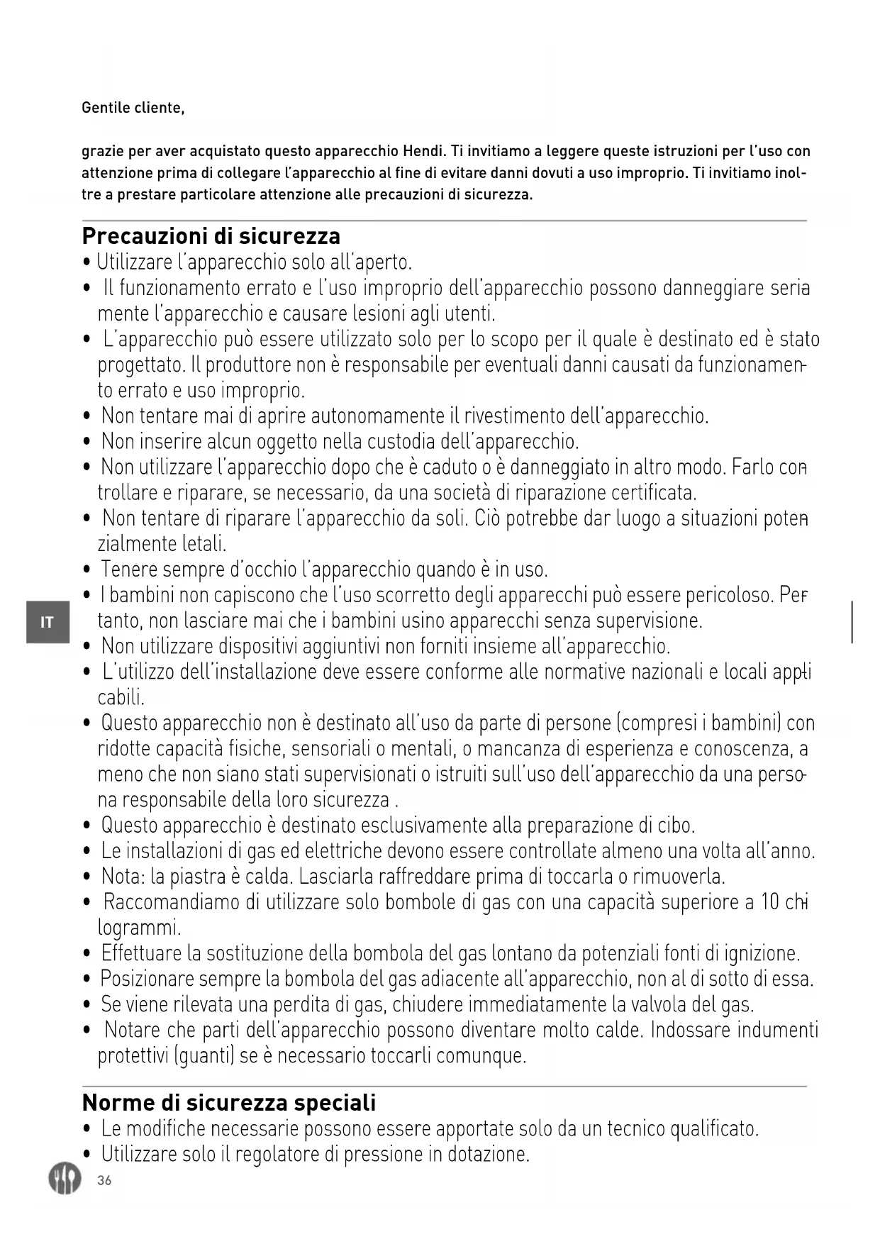 - Chiudere sempre la valvola del gas sulla bombola del gas se l’apparecchio non viene più utilizzato.