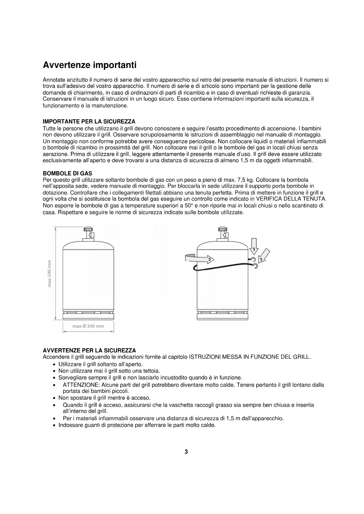 Tutte le personne cheutilizzano il grill devono conoscere e seguire l'esatto procedimento di accensione.I bambini non devono utilizzato il grill.Osservare scrupolosamente le istruzioni di assemblaggio nel manuale di montaggio. Un montaggio non conforme potrebbe averve consequences pericolose.Non collocare liquidi o materiali infiammabili o bombole di ricambio in prossimità del grill.Non collocare mai il grill o le bombole del gas in locali chiusienza aerazione.Prima di utilizzato il grill,leggere attendamente il presente manuale d'uso.I grill delve essere utilizzato esclusivamente all'aperto e delve trovarsi a una distance di sicurezza da almeno 1,5 m da oggetti infiammabili.