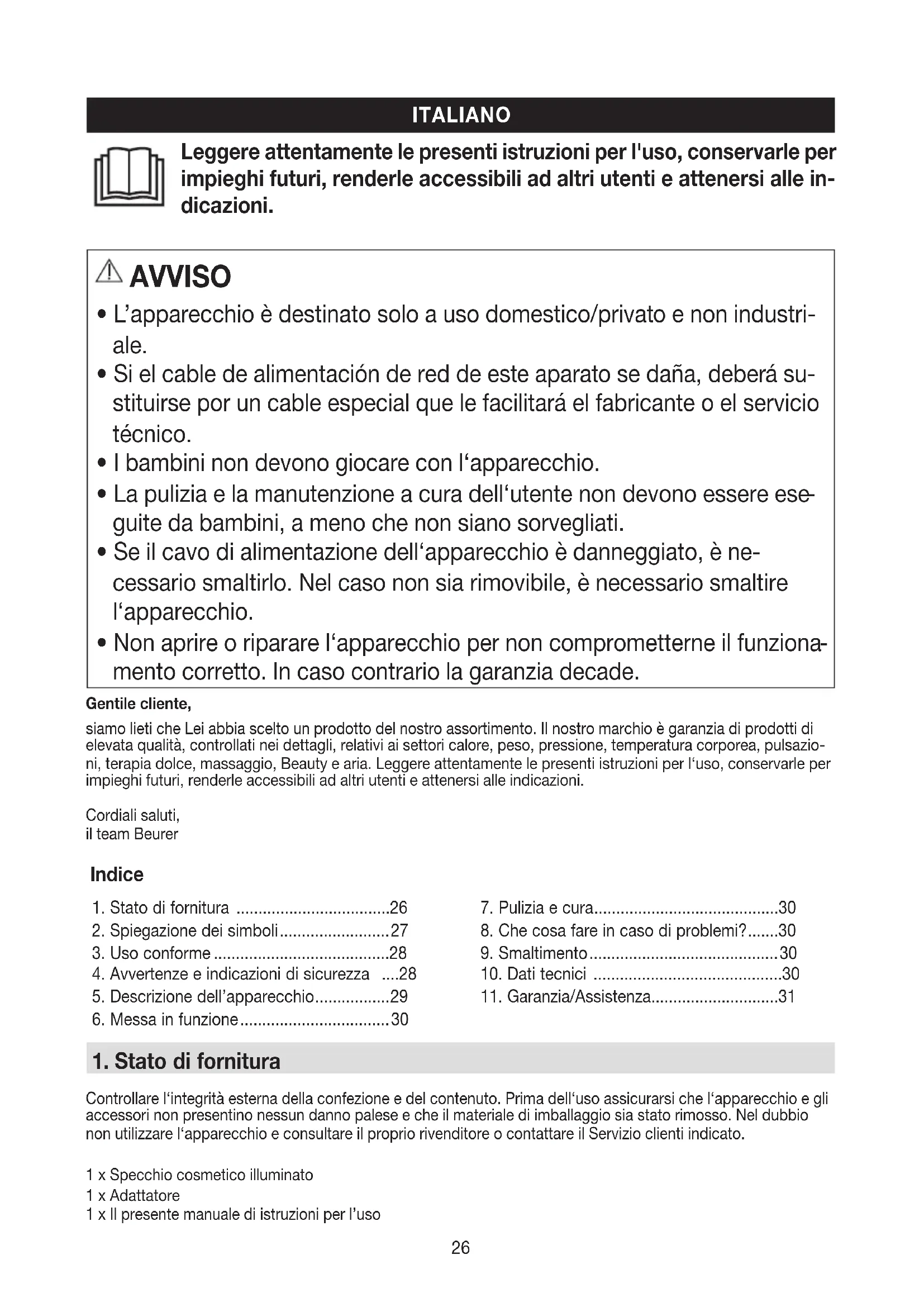 mento corretto. In caso contrario la garanzia decade. Gentile cliente, siamo lieti che Lei abbia scelto un prodotto del nostro assortimento. Il nostro marchio è garanzia di prodotti di elevata qualità, controllati nei dettagli, relativi ai settori calore, peso, pressione, temperatura corporea, pulsazio ni, terapia dolce, massaggio, Beauty e aria. Leggere attentamente le presenti istruzioni per l‘uso, conservarle per impieghi futuri, renderle accessibili ad altri utenti e attenersi alle indicazioni.Cordiali saluti, il team BeurerIndice1. Stato di fornitura ...................................26