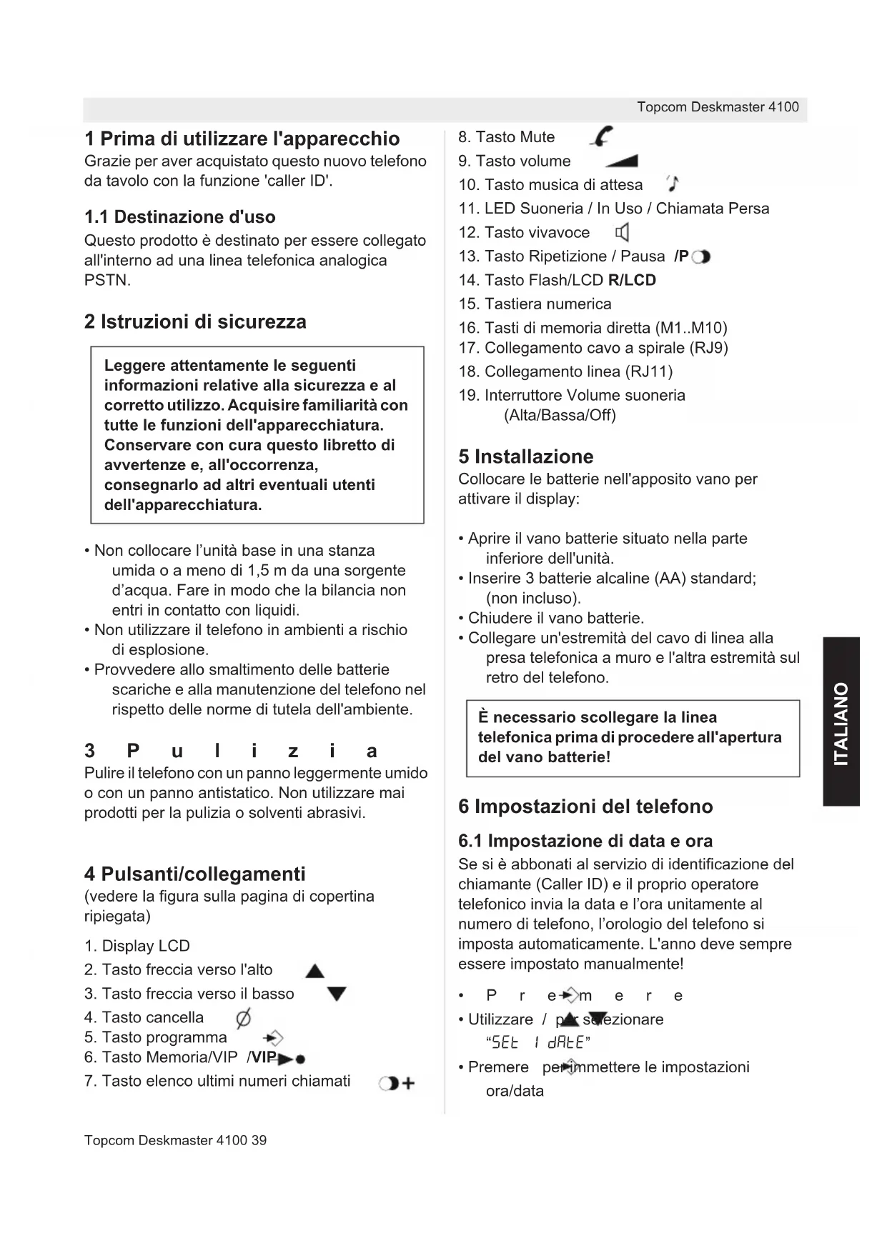 - Premere per immettere le impostazioni ora/data Leggere attentamente le seguenti informazioni relative alla sicurezza e al corretto utilizzo. Acquisire familiarità con tutte le funzioni dell'apparecchiatura. Conservare con cura questo libretto di avvertenze e, all'occorrenza, consegnarlo ad altri eventuali utenti dell'apparecchiatura. È necessario scollegare la linea telefonica prima di procedere all'apertura del vano batterie!40 Topcom Deskmaster 4100 Topcom Deskmaster 4100