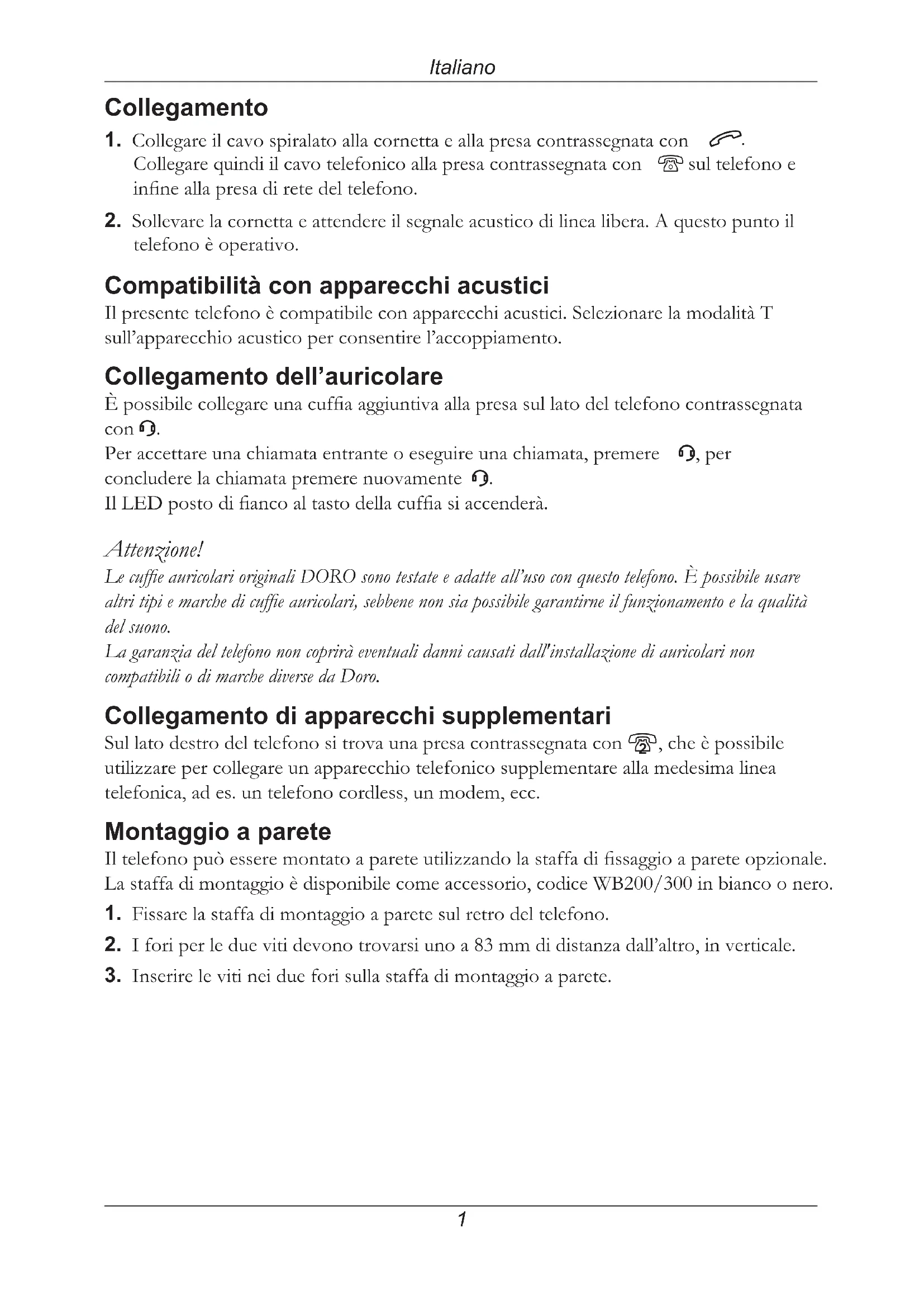 Il LED posto di anco al tasto della cufa si accenderà. Attenzione! Le cufe auricolari originali DORO sono testate e adatte all’uso con questo telefono. È possibile usare altri tipi e marche di cufe auricolari, sebbene non sia possibile garantirne il funzionamento e la qualità del suono. La garanzia del telefono non coprirà eventuali danni causati dall'installazione di auricolari non compatibili o di marche diverse da Doro. Collegamento di apparecchi supplementari Sul lato destro del telefono si trova una presa contrassegnata con 8, che è possibile utilizzare per collegare un apparecchio telefonico supplementare alla medesima linea telefonica, ad es. un telefono cordless, un modem, ecc. Montaggio a parete Il telefono può essere montato a parete utilizzando la staffa di ssaggio a parete opzionale. La staffa di montaggio è disponibile come accessorio, codice WB200/300 in bianco o nero.