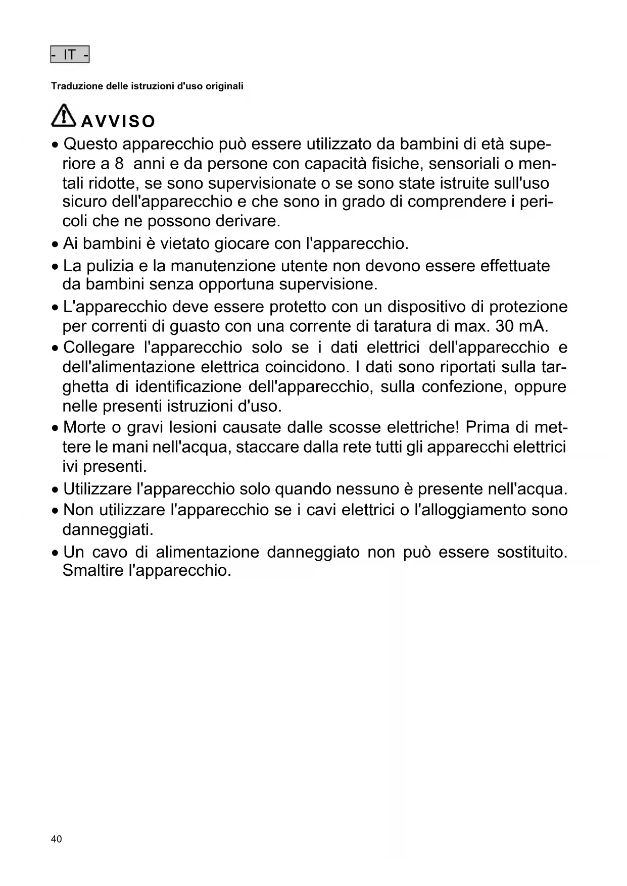 - Morte o gravi lesioni causate dalle scosse elettriche! Prima di met- tere le mani nell'acqua, staccare dalla rete tutti gli apparecchi elettrici ivi presenti.