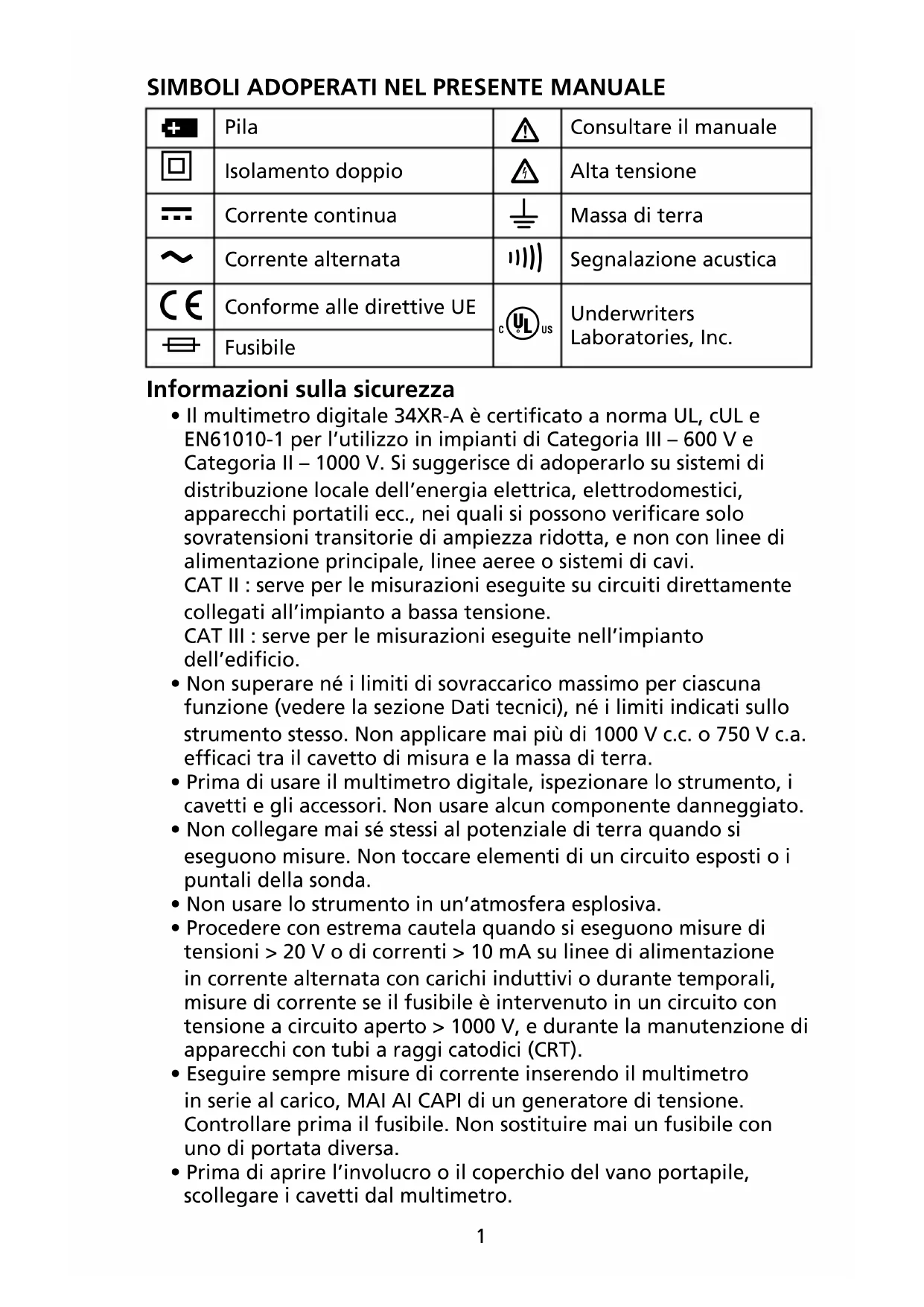 - Il multimetro digitale 34XR-A è certicato a norma UL, cUL e EN61010-1 per l’utilizzo in impianti di Categoria III – 600 V e Categoria II – 1000 V. Si suggerisce di adoperarlo su sistemi di distribuzione locale dell’energia elettrica, elettrodomestici, apparecchi portatili ecc., nei quali si possono verificare solo sovratensioni transitorie di ampiezza ridotta, e non con linee di alimentazione principale, linee aeree o sistemi di cavi. CAT II : serve per le misurazioni eseguite su circuiti direttamente collegati all’impianto a bassa tensione. CAT III : serve per le misurazioni eseguite nell’impianto dell’edificio.