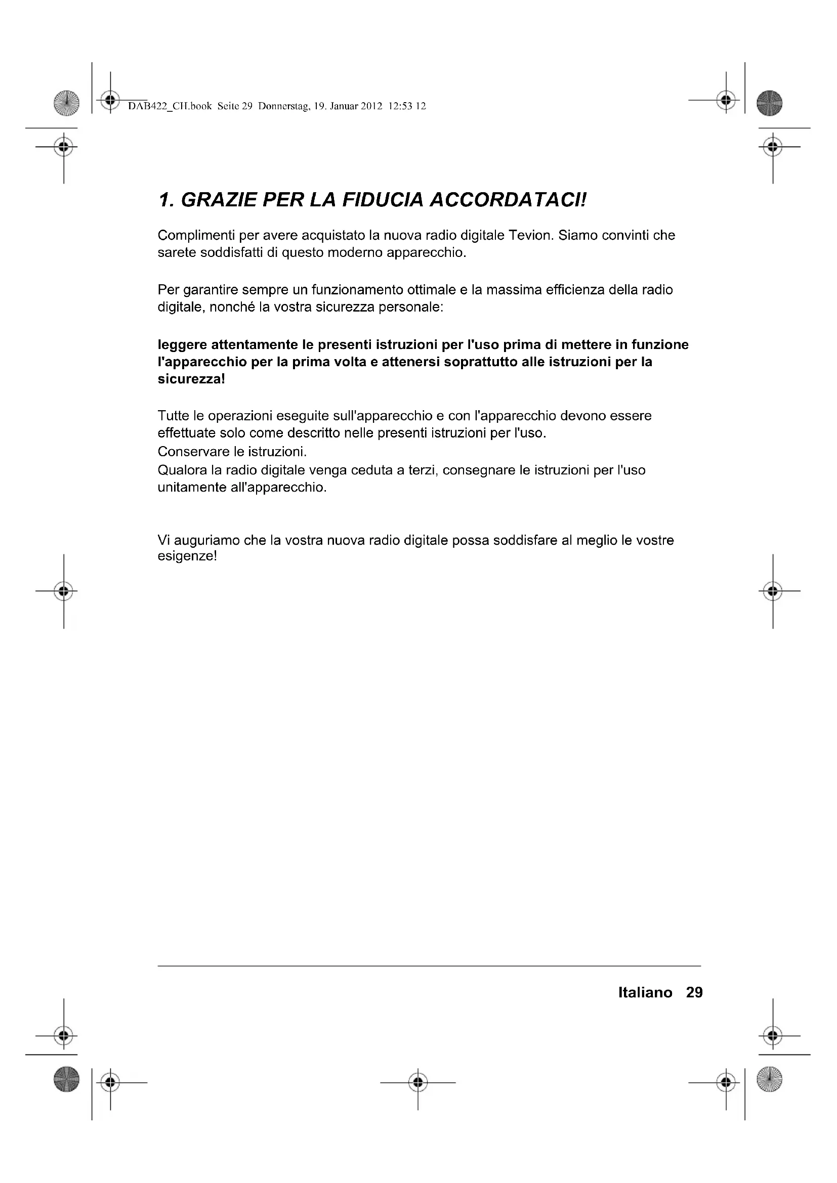 Complimenti per avere acquistato la nuova radio digitale Tevion. Siamo convinti che sarete soddisfatti di questo moderno apparecchio. Per garantire sempre un funzionamento ottimale e la massima efficienza della radio digitale, nonché la vostra sicurezza personale: leggere attentamente le presenti istruzioni per l'uso prima di mettere in funzione l'apparecchio per la prima volta e attenersi soprattutto alle istruzioni per la sicurezza! Tutte le operazioni eseguite sull'apparecchio e con l'apparecchio devono essere effettuate solo come descritto nelle presenti istruzioni per l'uso. Conservare le istruzioni. Qualora la radio digitale venga ceduta a terzi, consegnare le istruzioni per l'uso unitamente all'apparecchio. Vi auguriamo che la vostra nuova radio digitale possa soddisfare al meglio le vostre esigenze! DAB422_CH.book Seite 29 Donnerstag, 19. Januar 2012 12:53 1230 Italiano